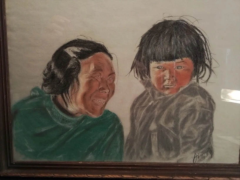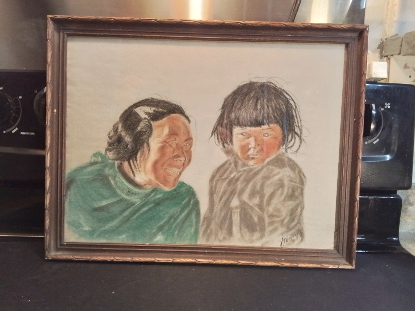 An Excellent Signed Pastel Painting A very well done pastel painting. Condition: Good Condition Measurements: 17.5 by 13.5 inches framed Framed pastel drawing of an older woman and a young girl. The woman is wearing a green sweater and the young girl is wearing a dark jacket. The drawing is signed in the bottom right corner. The frame is made of dark wood and has a simple design. Pickup at Young Street and Steels Ave