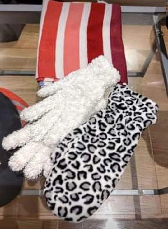 Pair of white fuzzy gloves, leopard print design mittens, and a multicolor scarf