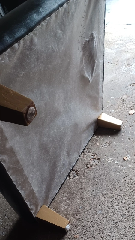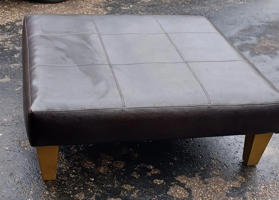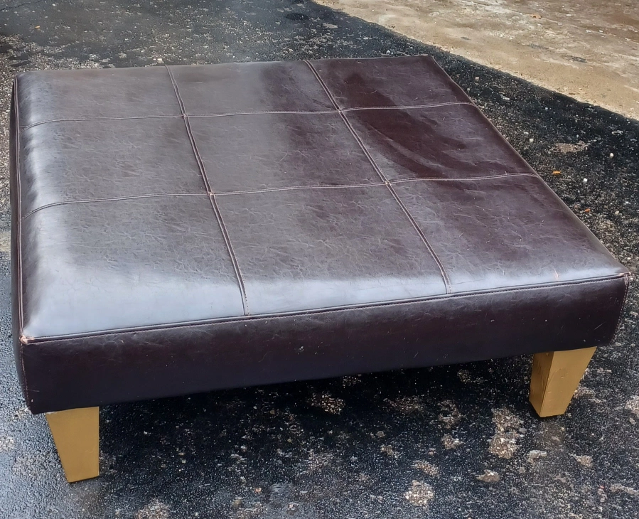 Square ottoman with tufted top. Wood legs with a gold finish. Under is little tear it doesn't affect anything . if you want, you can remove it. Minnor scratches 43"×43" high 15"