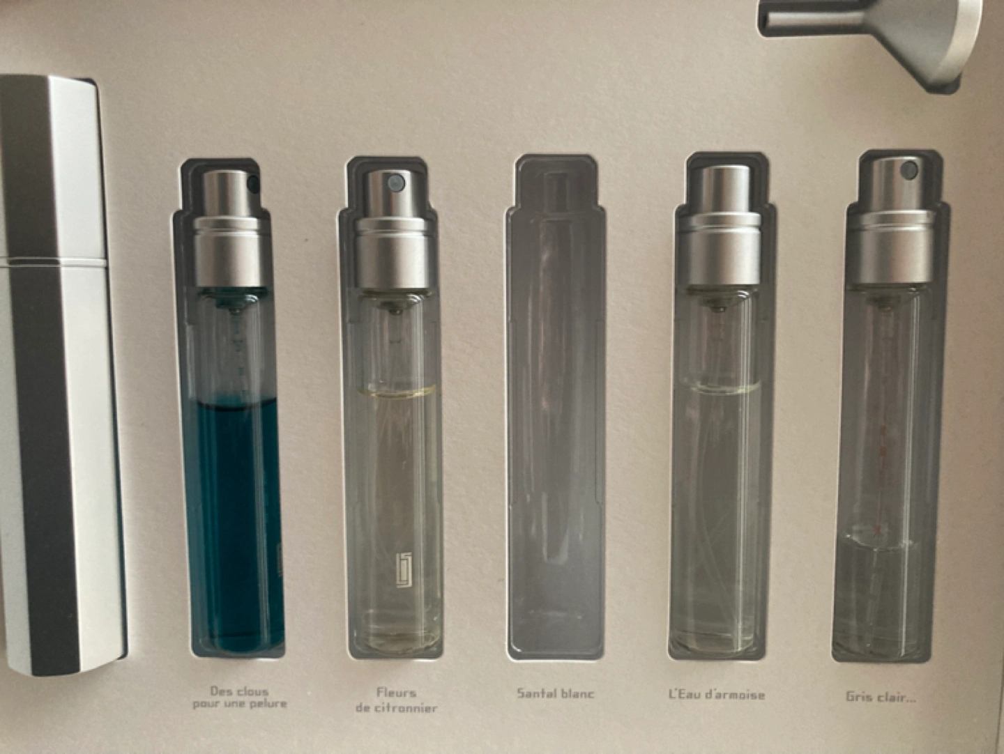 Serge Lutense Discovery Travel set 7.5ml ( comes 3/4 full retail) One or two sprays missing from Des Clous Pour une Pelure L’eau D’armoise Fleures De Citronnier Gris Clair - 2-3mls left Santa Blanc ( not included)
