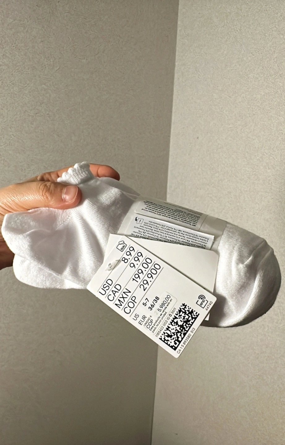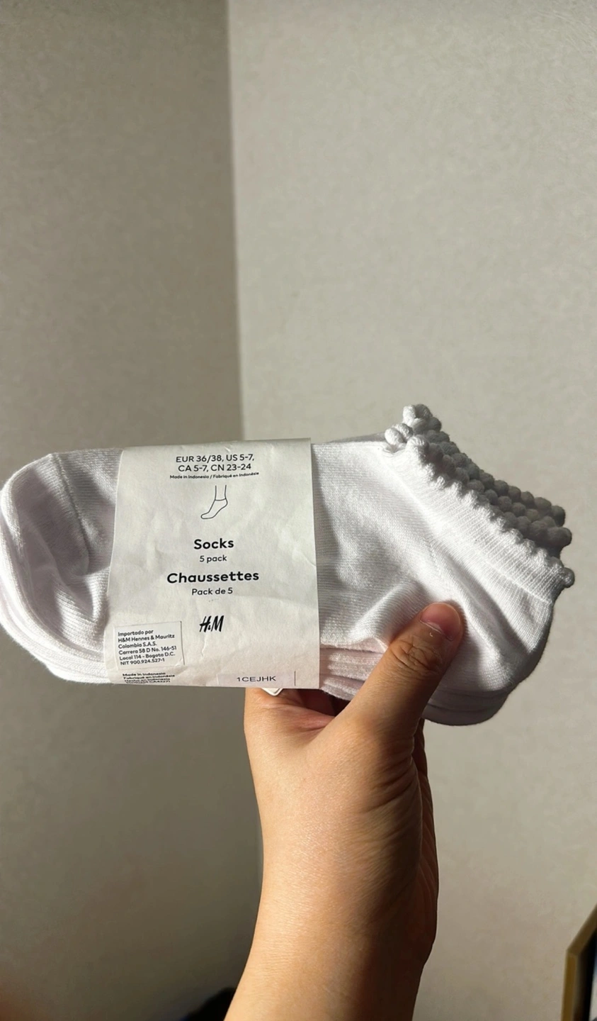 This is a 5-pack of white socks by H&M. They come up right up to your ankle line and with clean white look, they match well with any shoes. This is a new item. They are machine washable. Retail price: $9.99 for sizes EUR 36/38, US/CAD 5-7
