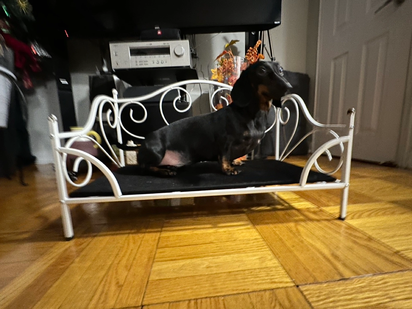 White metal dog bed. Small size. Has a black mat cushion. Some paint chipping.
