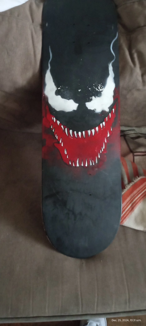 Custom painted skateboard deck featuring a Venom design. Good condition.