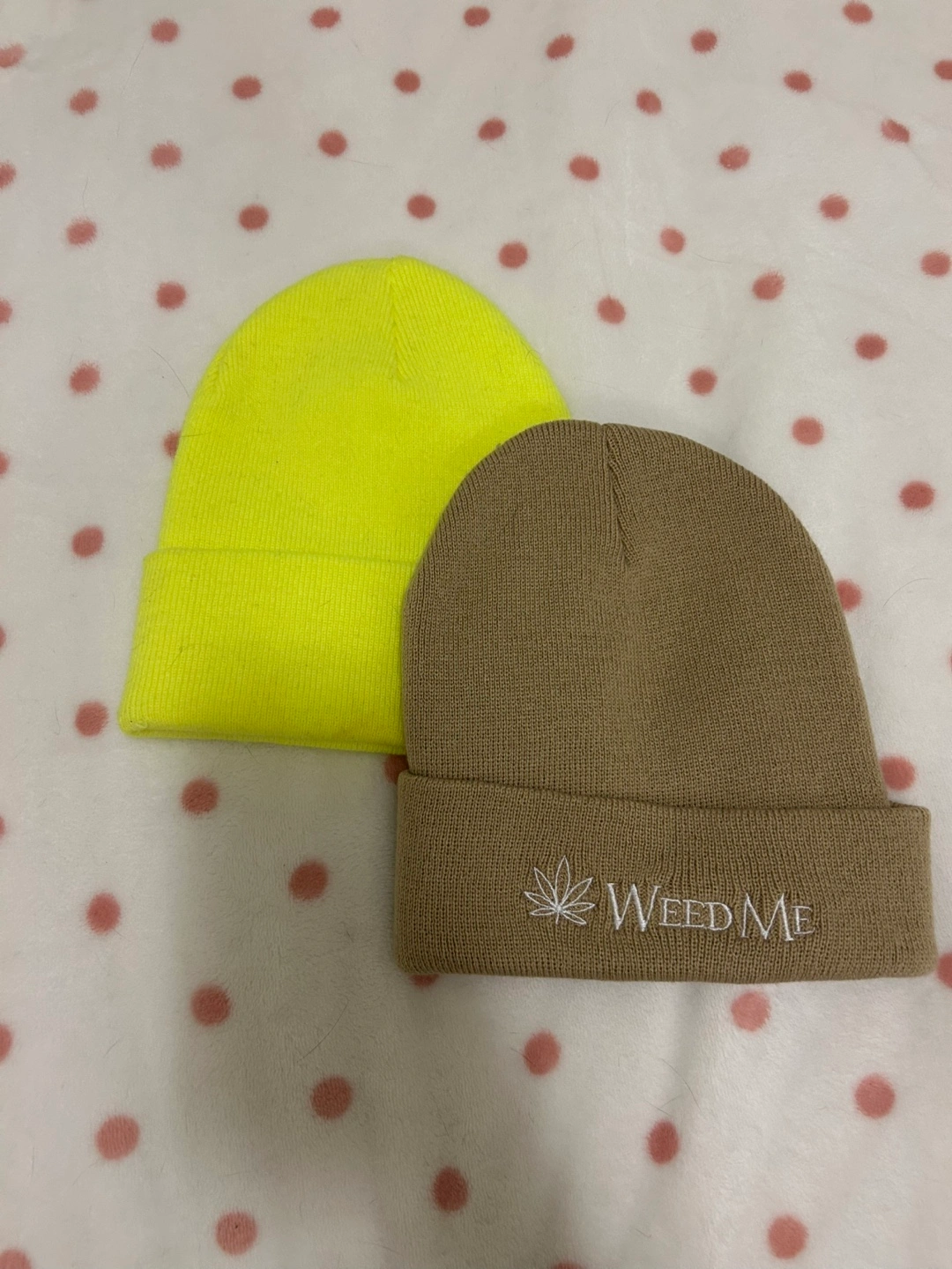 Two knit beanies, one highlighter yellow and one taupe brown with white embroidery. Unisex. Cash only. Msg to schedule pick up:)