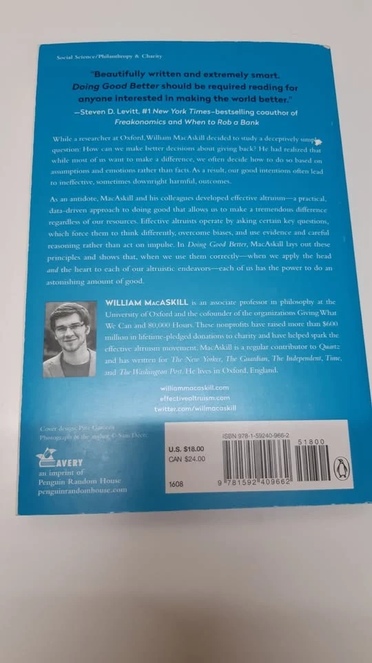 Novel for sale, no writing or damage. Its by the folks behind the 80,000 hours movement. Pickup in Scarborough, available until ad removed. Synopsis: An up-and-coming visionary in the world of philanthropy and a cofounder of the effective altruism movement explains why most of our ideas about how to make a difference are wrong and presents a counterintuitive way for each of us to do the most good possible. While a researcher at Oxford, William MacAskill decided to devote his study to a simple question: How can we do good better? MacAskill realized that, while most of us want to make a difference, we often decide how to do so based on assumptions and emotions rather than facts. As a result, our good intentions often lead to ineffective, sometimes downright harmful, outcomes. As an antidote, MacAskill and his colleagues developed effective altruism—a practical, data-driven approach to doing good that allows us to make a tremendous difference regardless of our resources. Effective altruists operate by asking certain key questions that force them to think differently, set aside biases, and use evidence and careful reasoning rather than act on impulse. In Doing Good Better, MacAskill lays out these principles and shows that, when we use them correctly—when we apply the head and the heart to each of our altruistic endeavors—each of us has the power to do an astonishing amount of good.