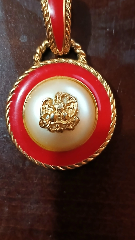Gold tone pendant with a red enamel outer ring and a white pearl-like centre featuring a gold tone design. Includes a gold tone bail.