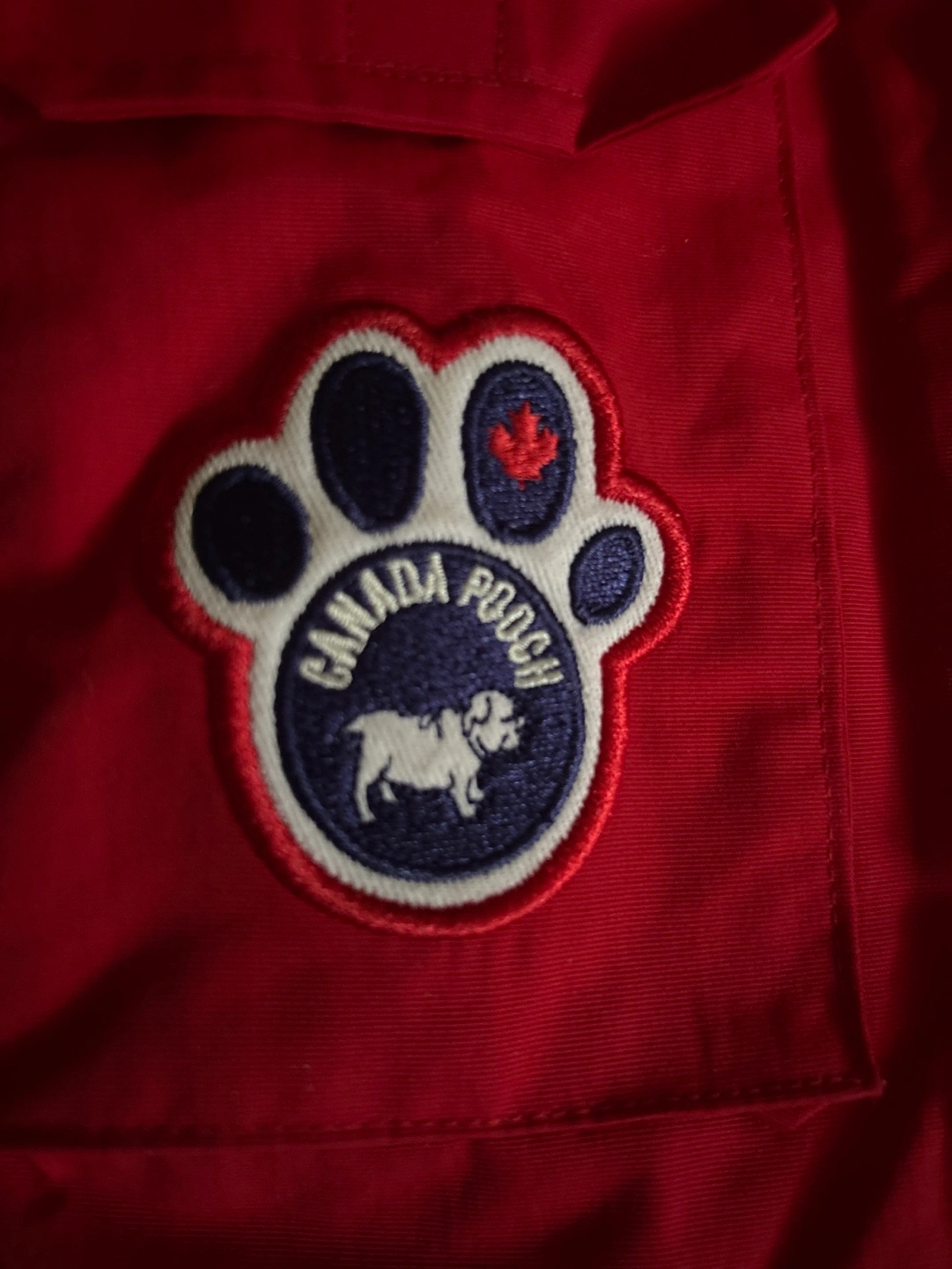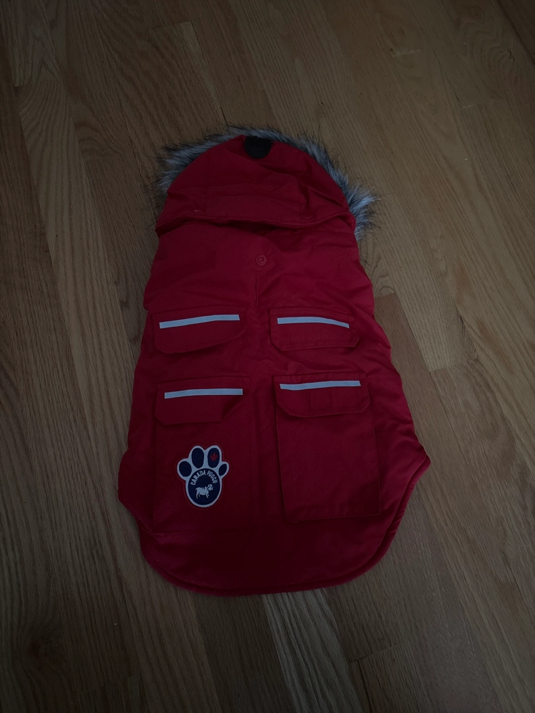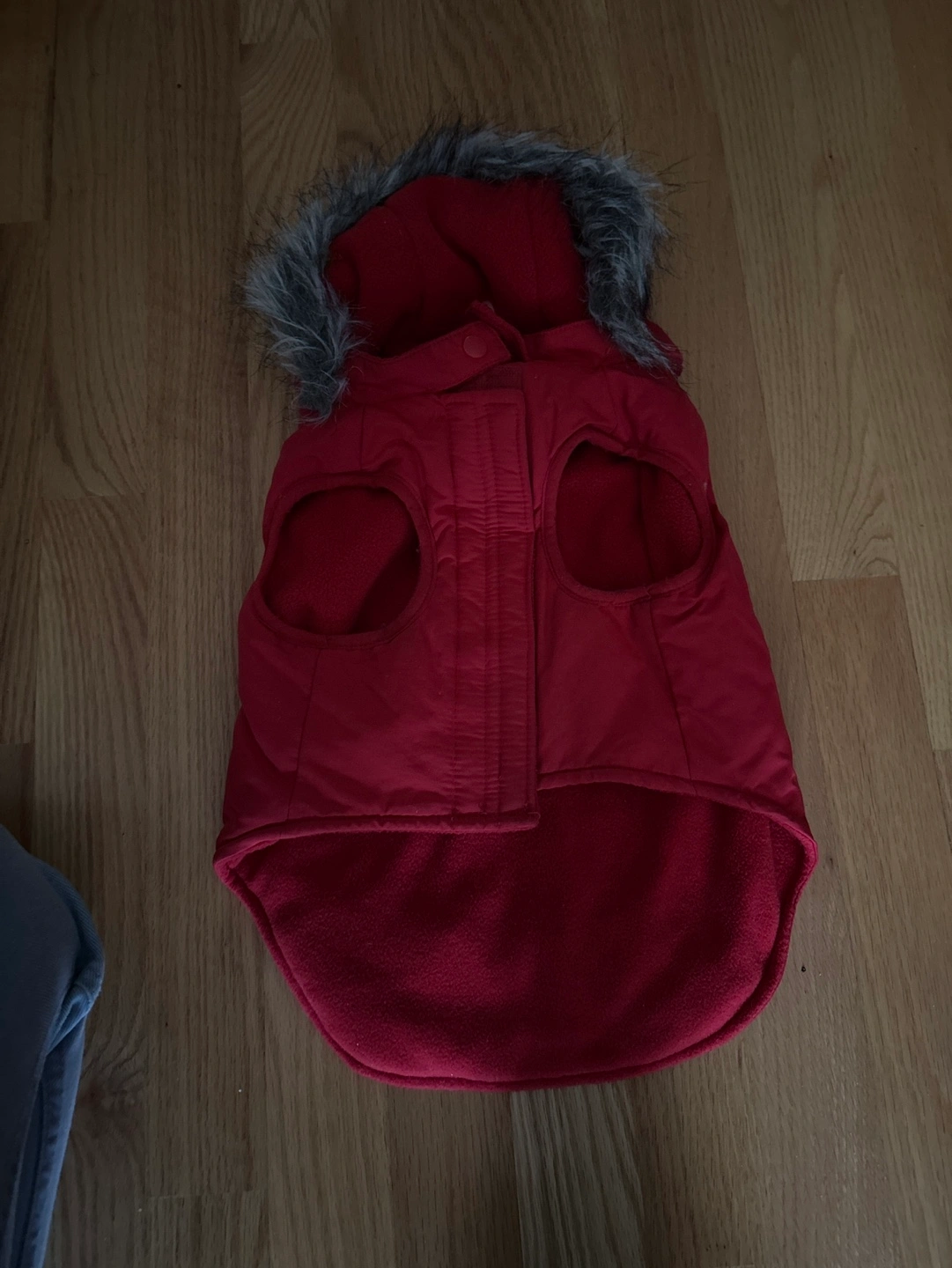 Red winter coat with fur-lined hood. Has multiple pockets and a snap closure. Size 14 (small to medium dog)