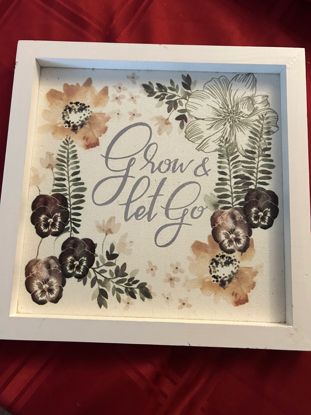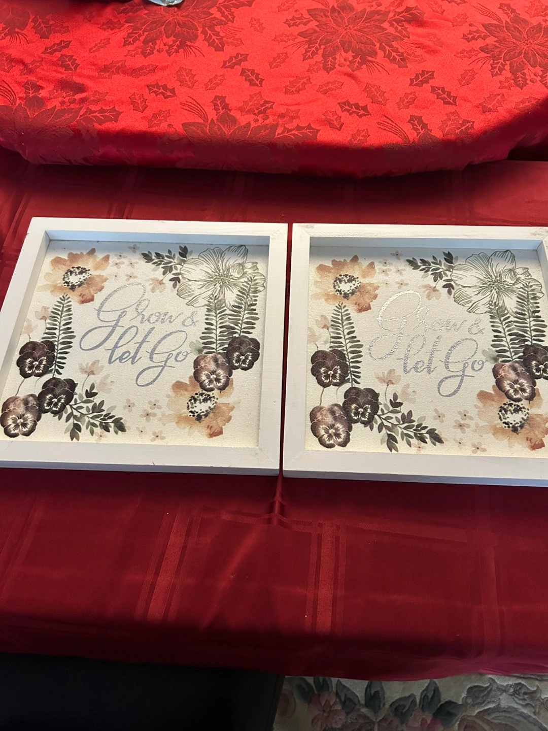 Set of 2 framed wall decor with a floral design and the words 'Grow & Let Go'. White frames.