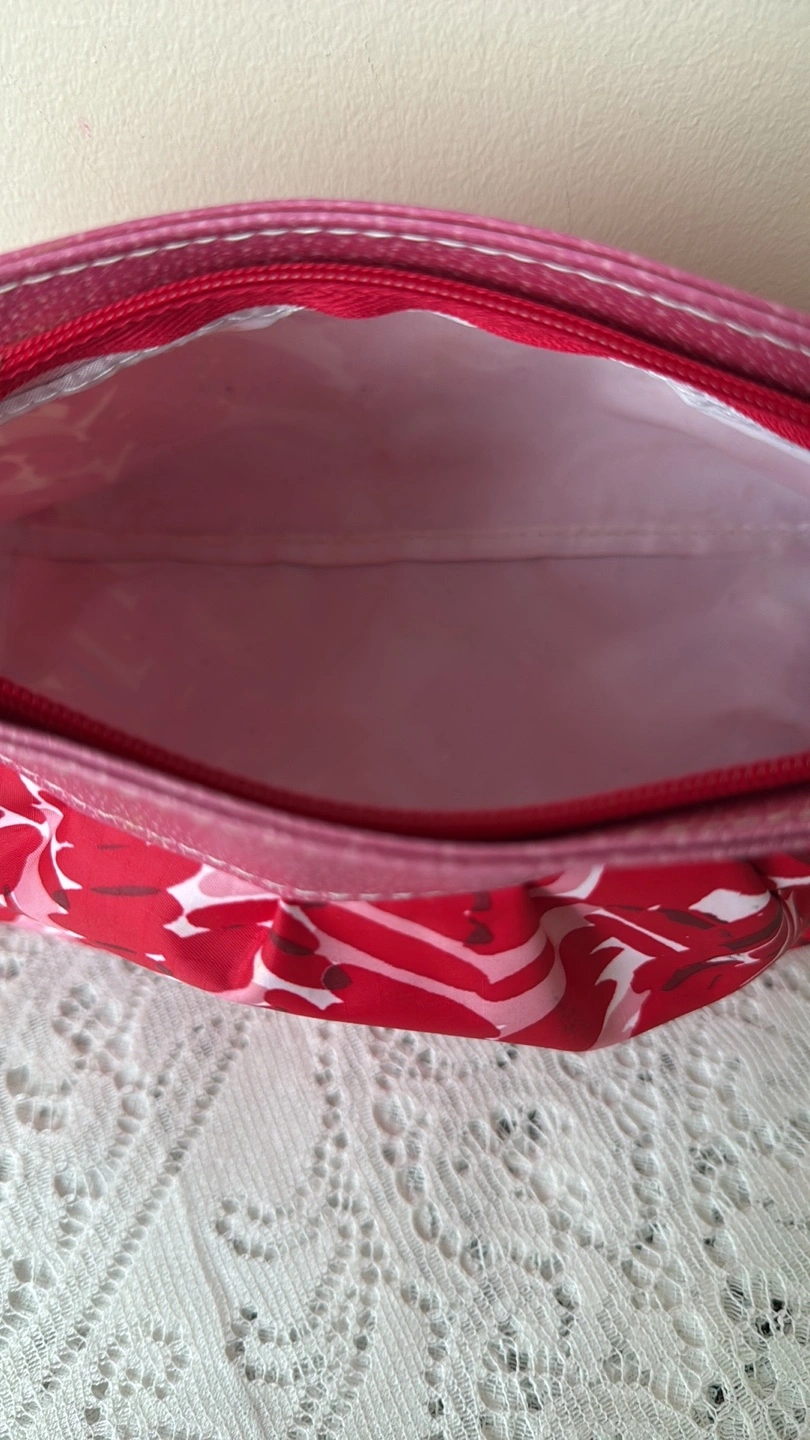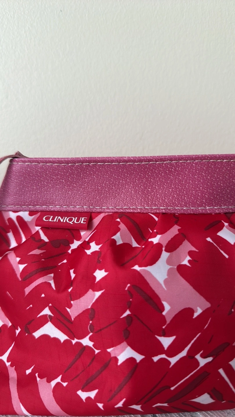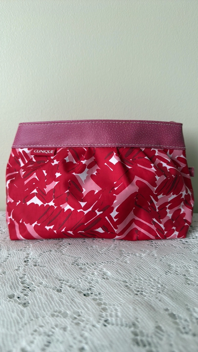 PICKUP LOCATION: Scarborough Town Centre Mall Only, evenings (cash payment) CLINIQUE MAKEUP BAG ***Red and pink colour ***Zipper closure ***CONDITION: Good, has been cleaned well, some minor stains remain from use in the lining, zipper ***Absolutely no rips or tears. Zipper works well. DIMENSIONS (approx. in inches) Centre Width: 9.5” Height: 6”