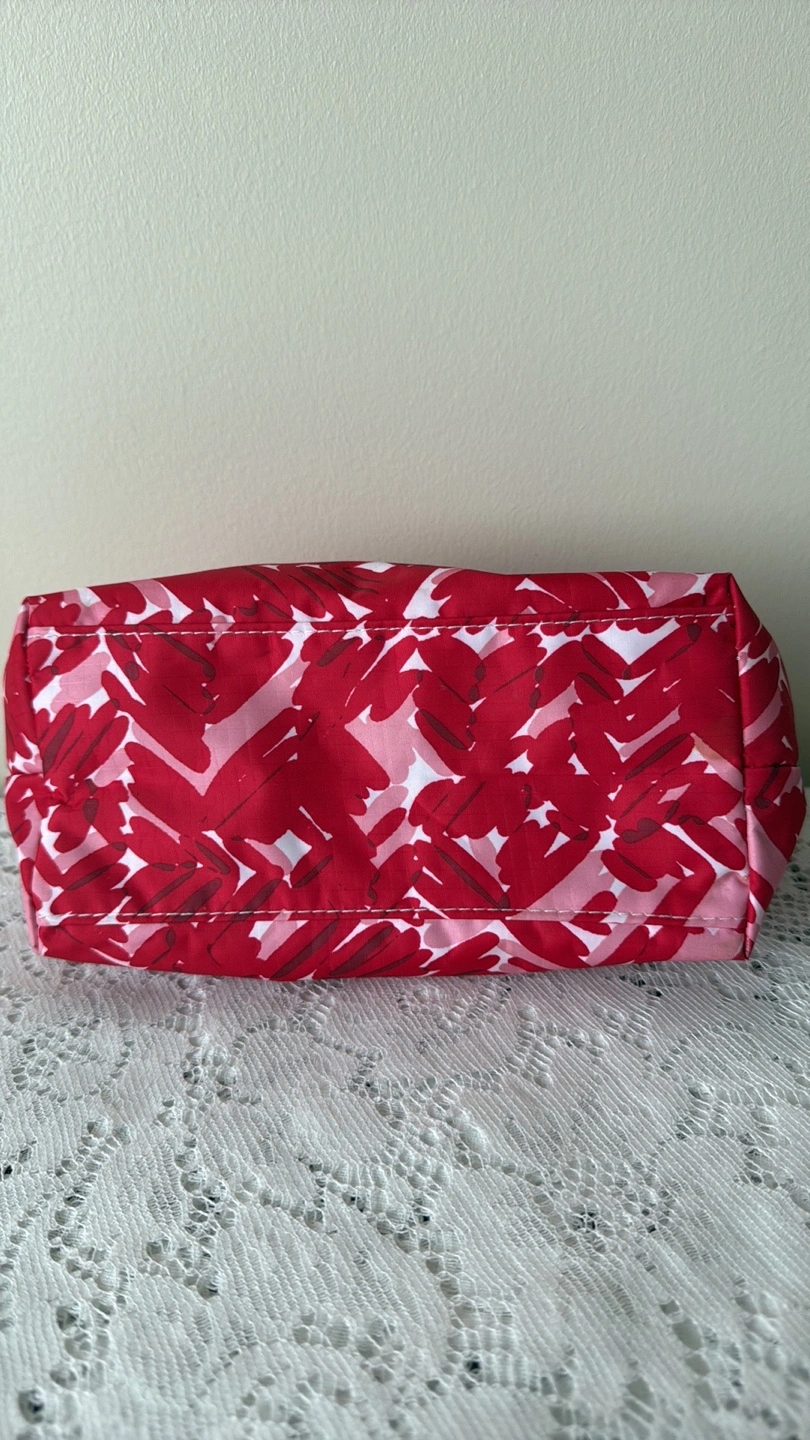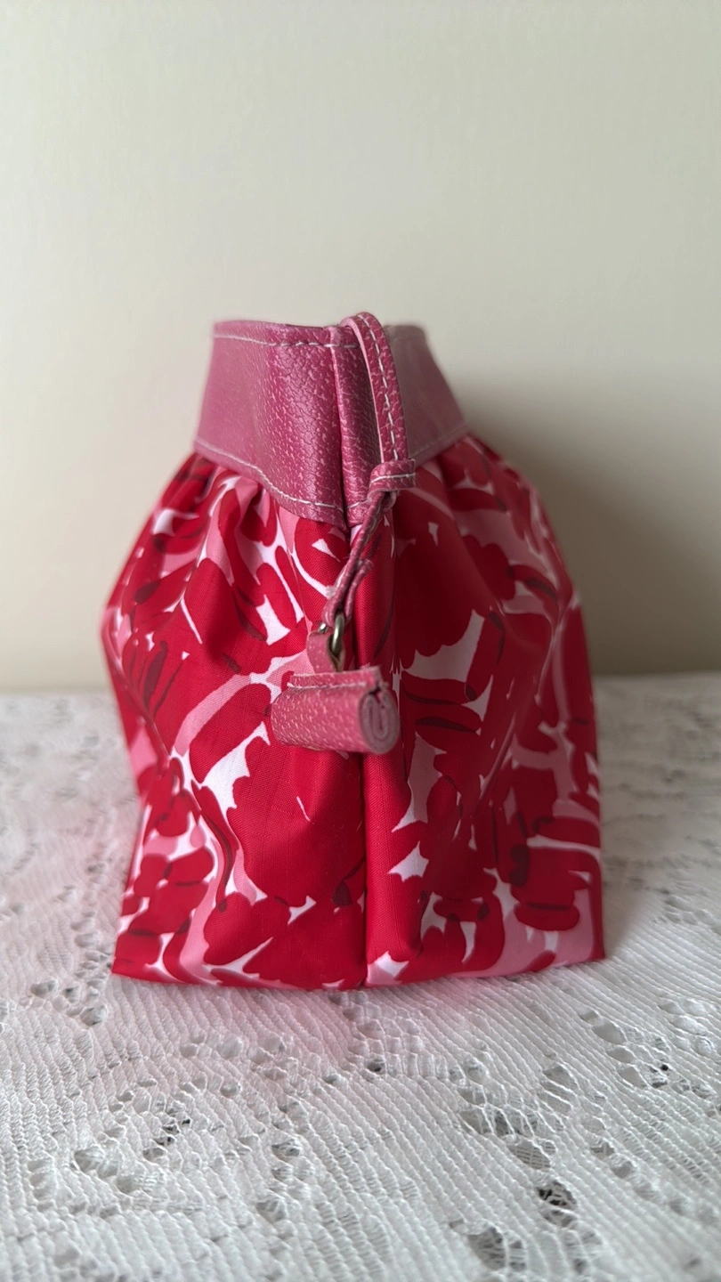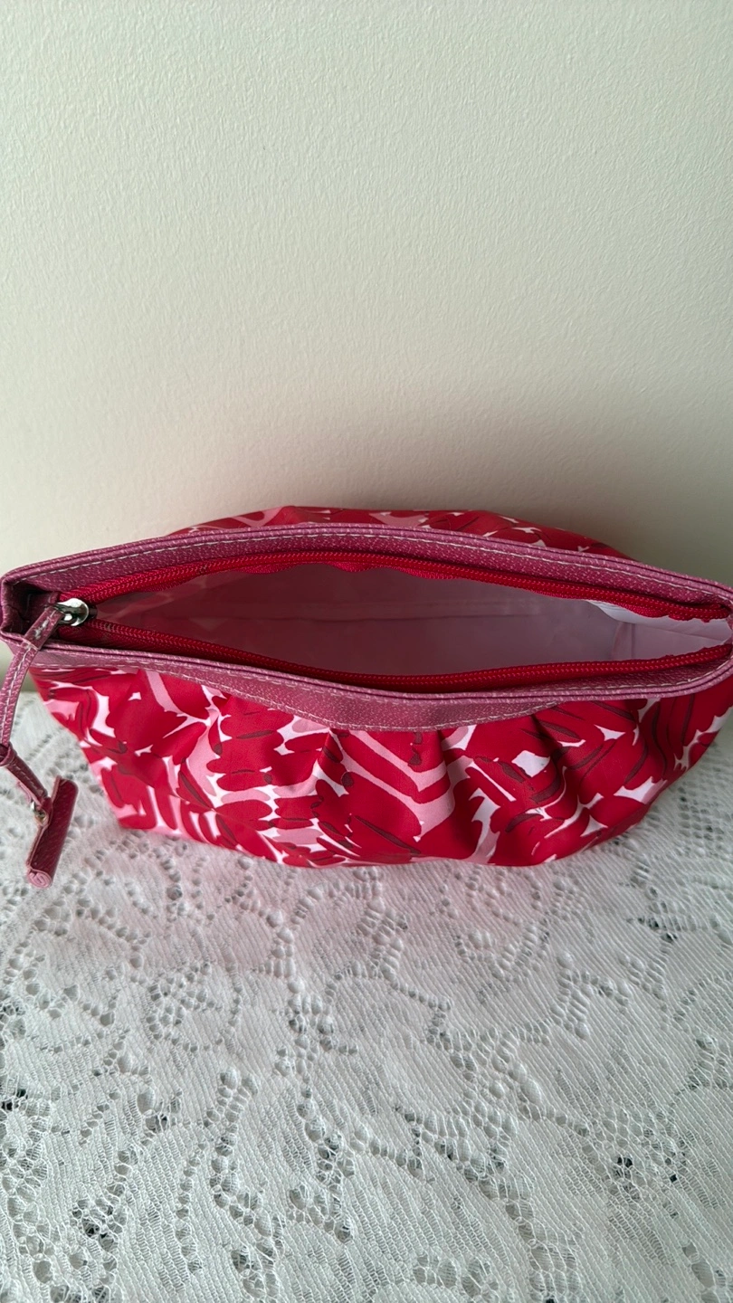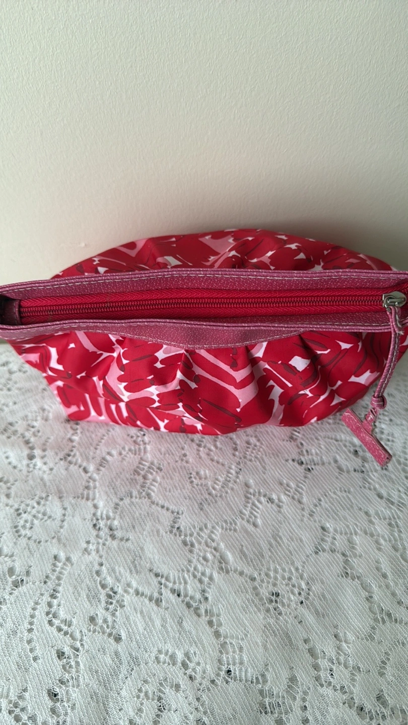 PICKUP LOCATION: Scarborough Town Centre Mall Only, evenings (cash payment) CLINIQUE MAKEUP BAG ***Red and pink colour ***Zipper closure ***CONDITION: Good, has been cleaned well, some minor stains remain from use in the lining, zipper ***Absolutely no rips or tears. Zipper works well. DIMENSIONS (approx. in inches) Centre Width: 9.5” Height: 6”