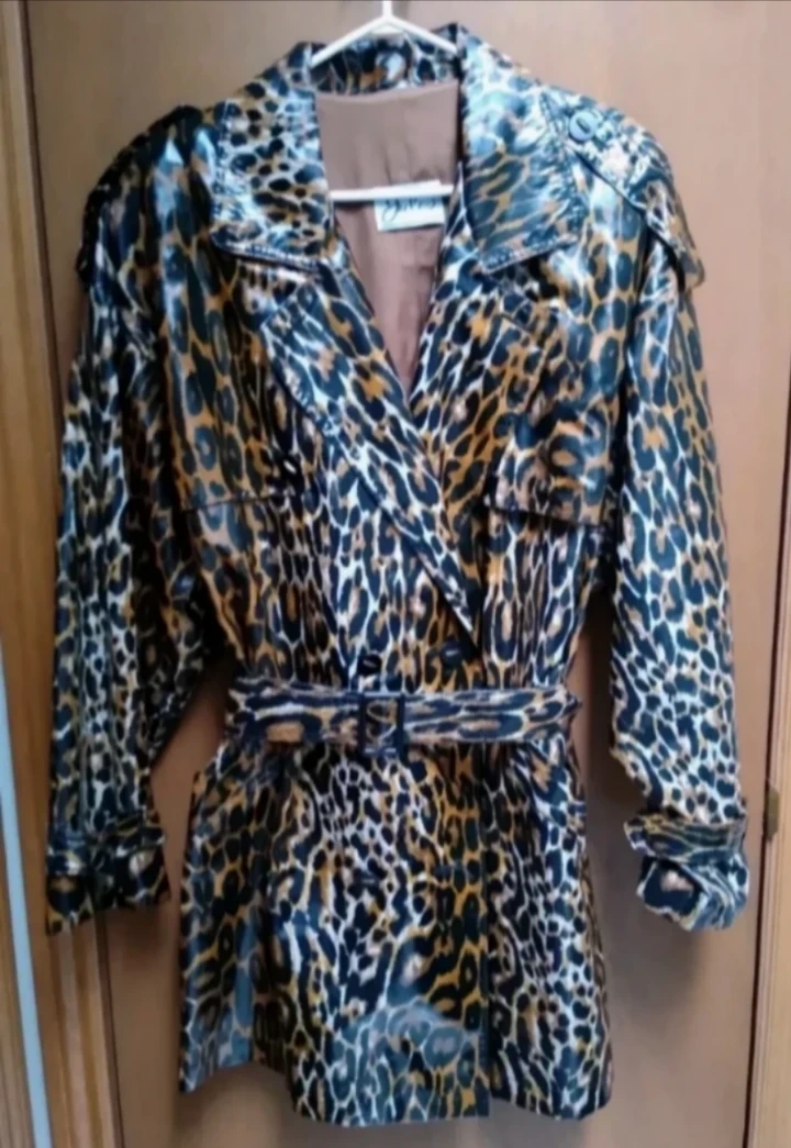 Ladies animal print, vinyl 3/4 length raincoat with belt. Waterproof. Size large. In great condition. Size: Large (12 - 14)