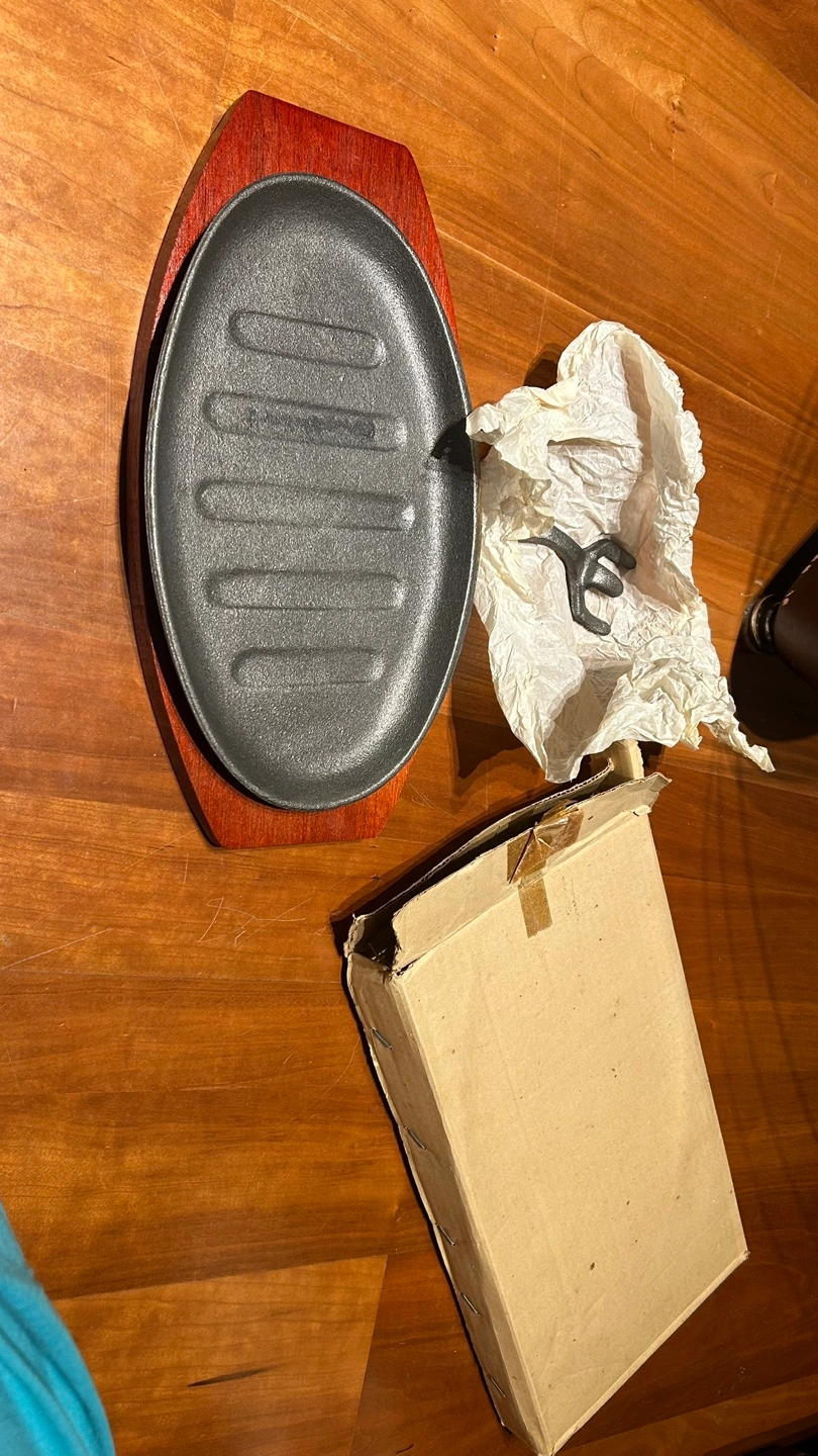 Oval cast iron platter with wooden base. Great for serving steak or other foods. Pickup Richmond brighouse station or McDonalds no 3 road