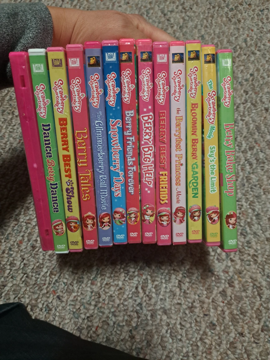 Set of 13 Strawberry Shortcake DVDs. Titles include: Berry Best Show, Berry Tales, The Glimmerberry Ball Movie, Snowberry Days, Berry Friends Forever, Berry Big Help, Berry Best Friends, The Berryfest Princess Movie, Bloomin' Berry Garden, Sky's the Limit - The Movie, and Berry Bake Shop. Great for learning about friendship. Hours of viewing.