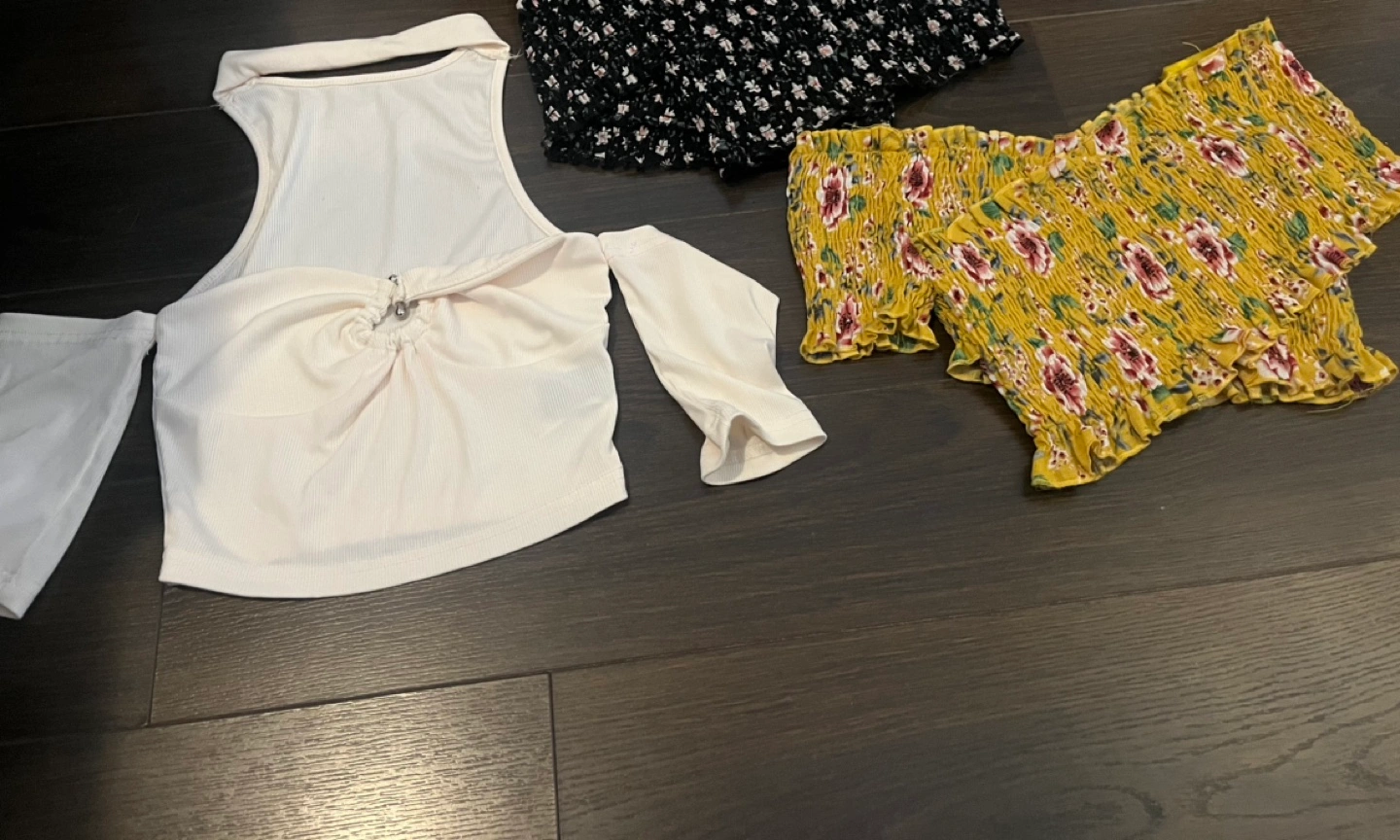 White ribbed knit cropped top. Off the shoulder with a choker neckline. Has a tie detail in the front. Flower print top. Off the shoulder.