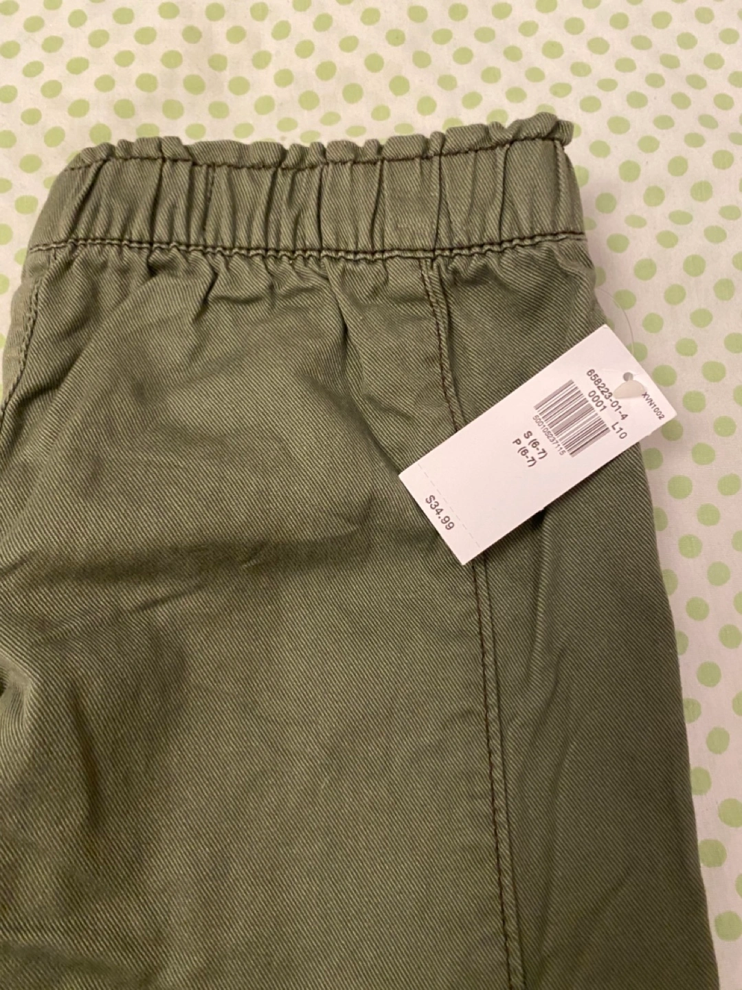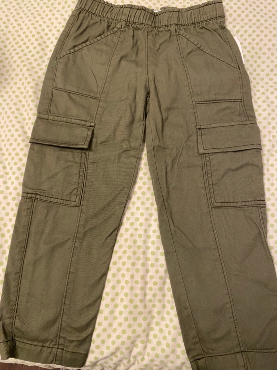 Green cargo pants with multiple pockets. Elastic waistband. Size 6-7