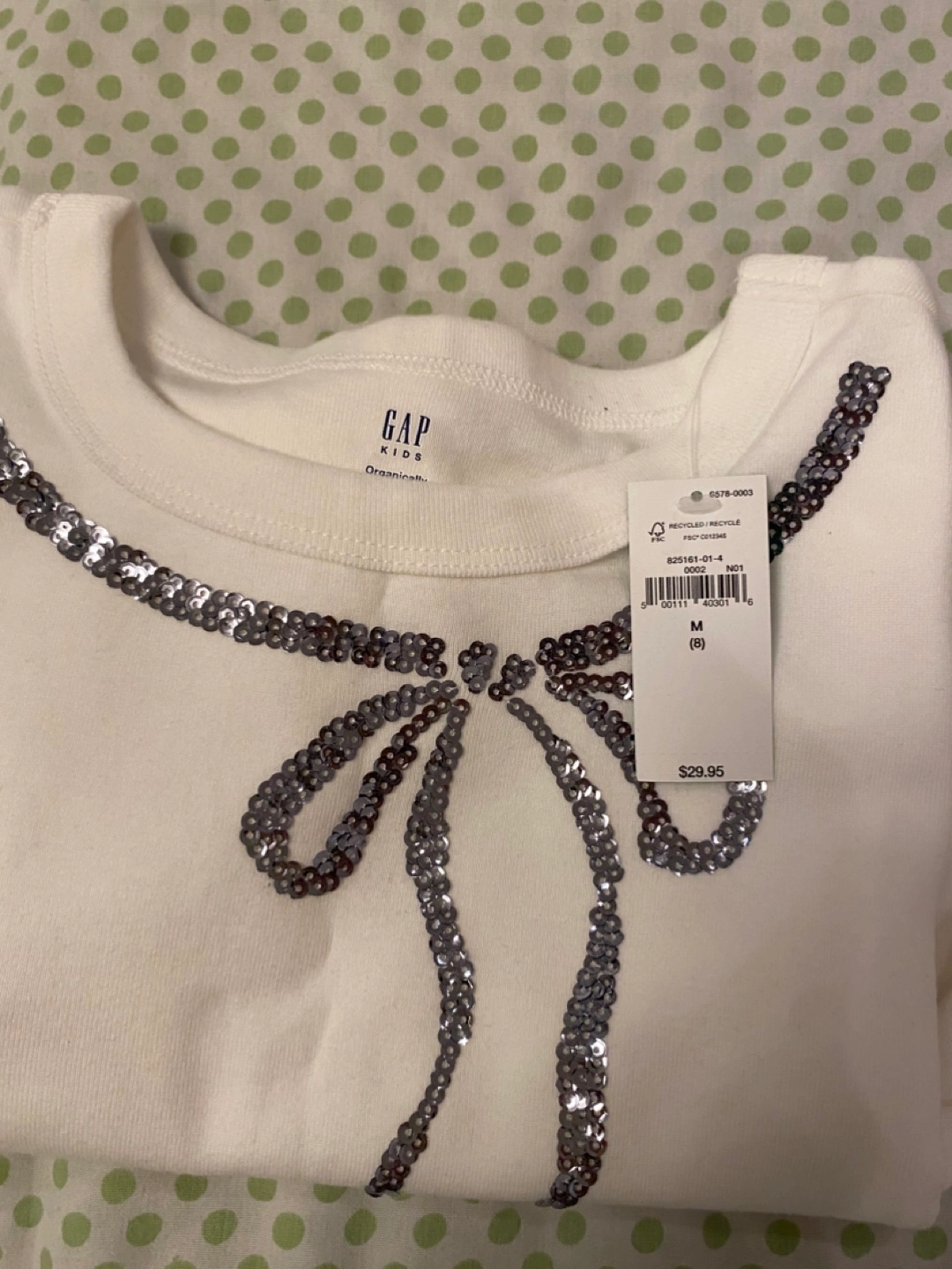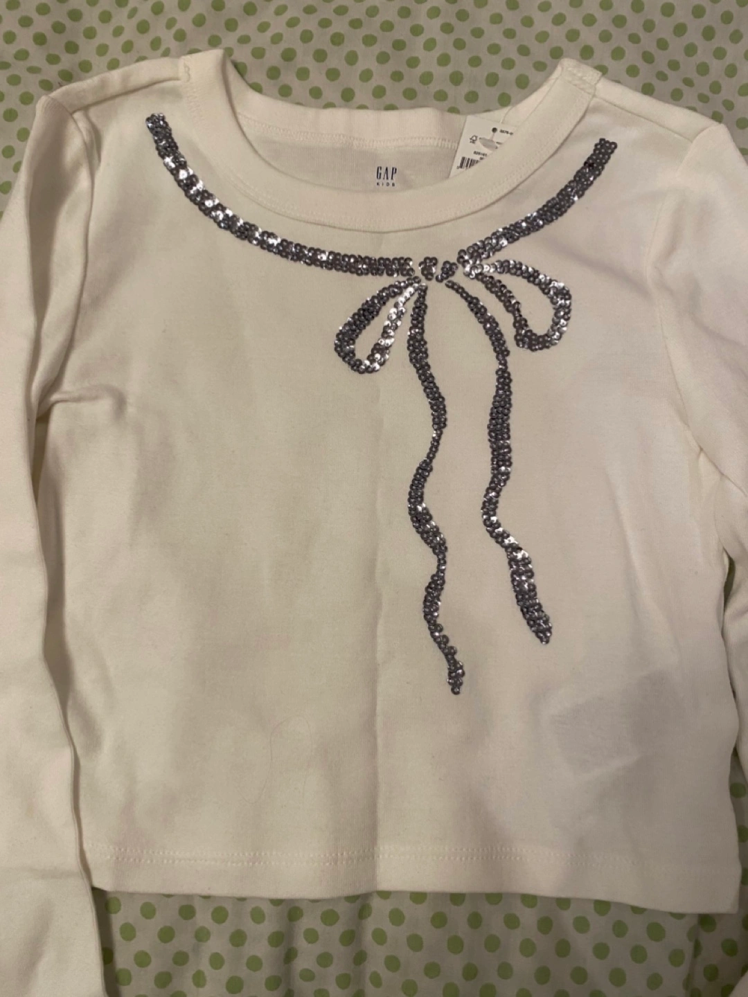 White long sleeve shirt with a sequined bow on the front. Size M (8).