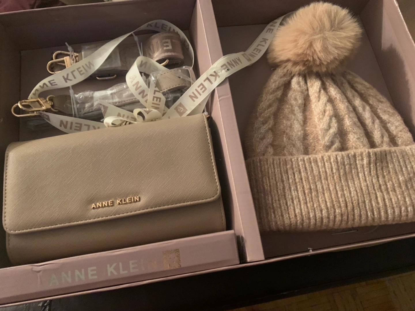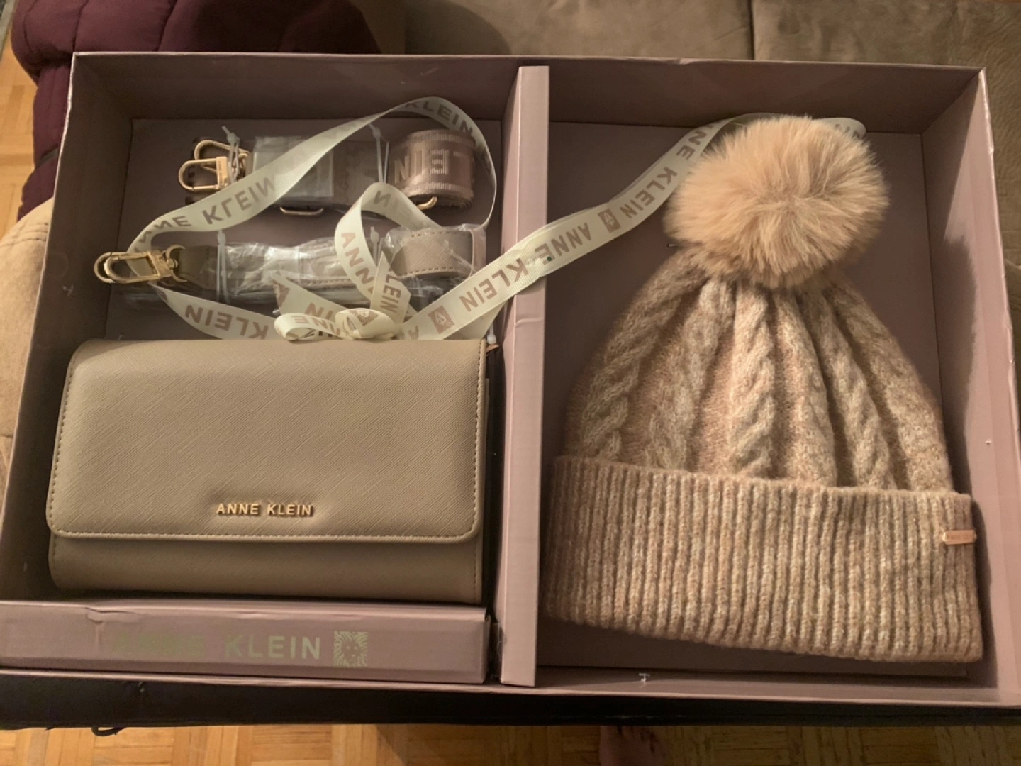 Set includes a small handbag with two straps, and a beanie with a pom-pom. The set is new and in the original packaging. -smoke free household Pickup only