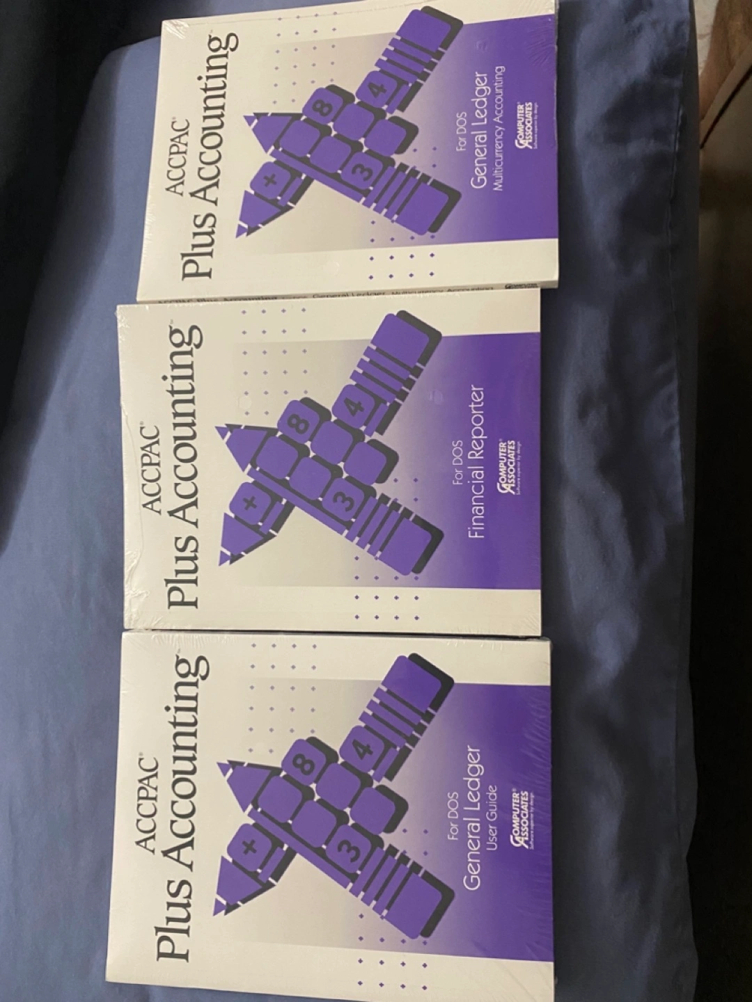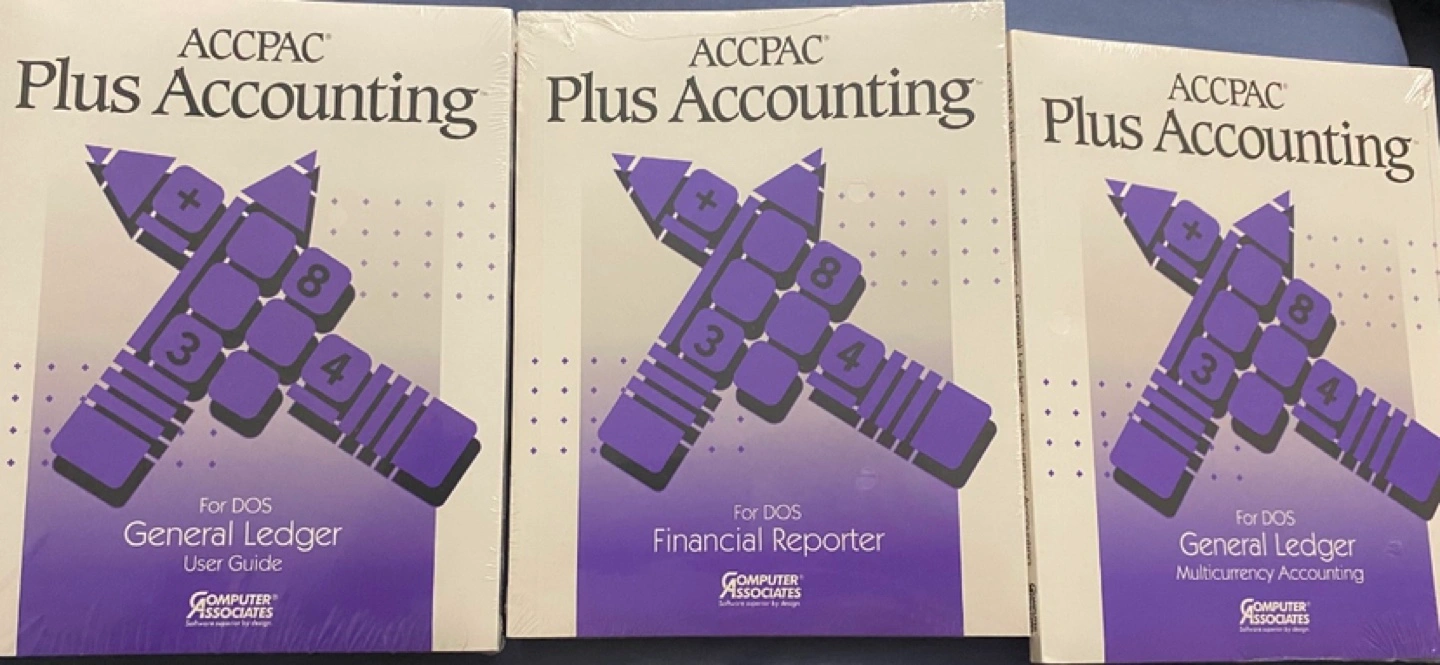 Set of three manuals for Accpac Plus Accounting: General Ledger User Guide, Financial Reporter, General Ledger Multicurrency Accounting. For DOS.