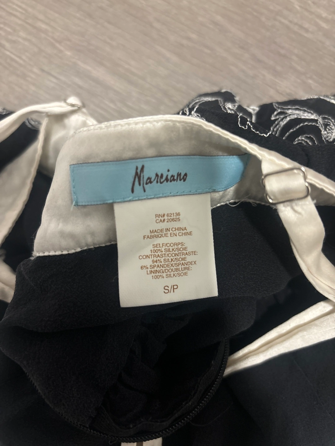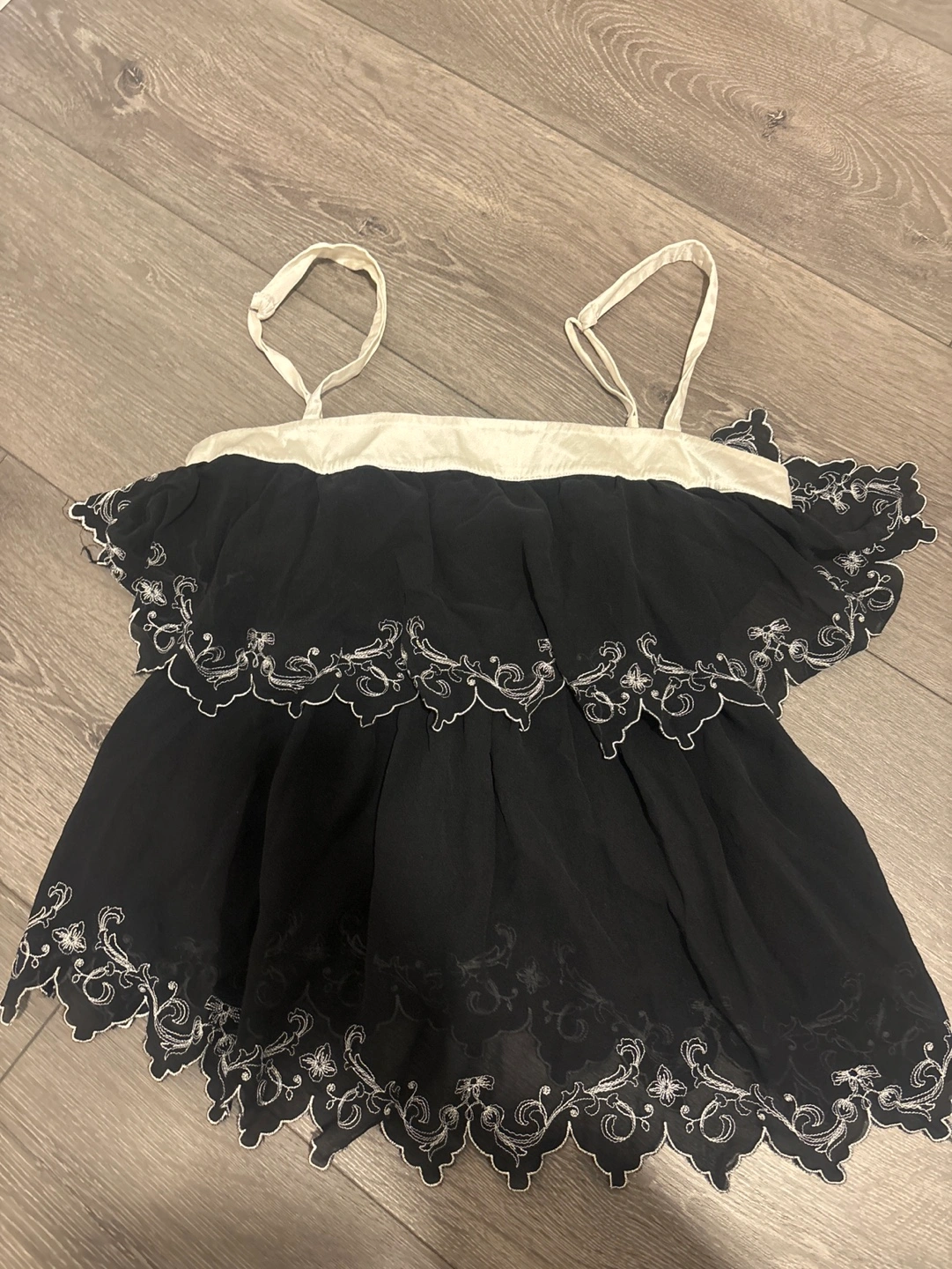 Black top with white embroidery and ruffle detail. Sleeveless with adjustable straps. 100%silk