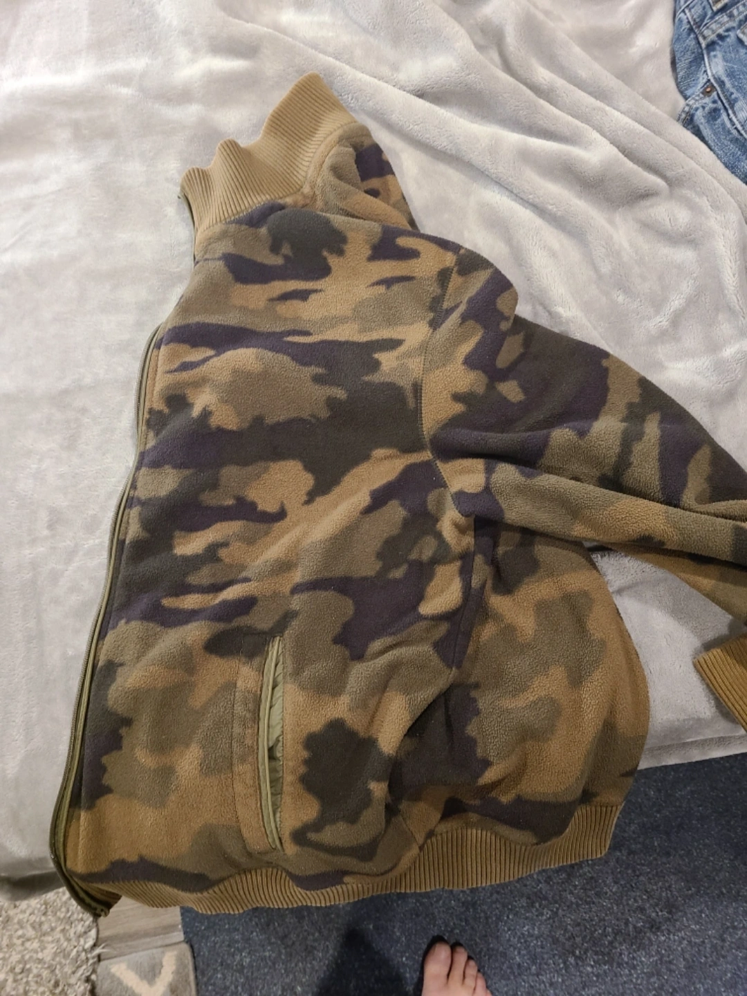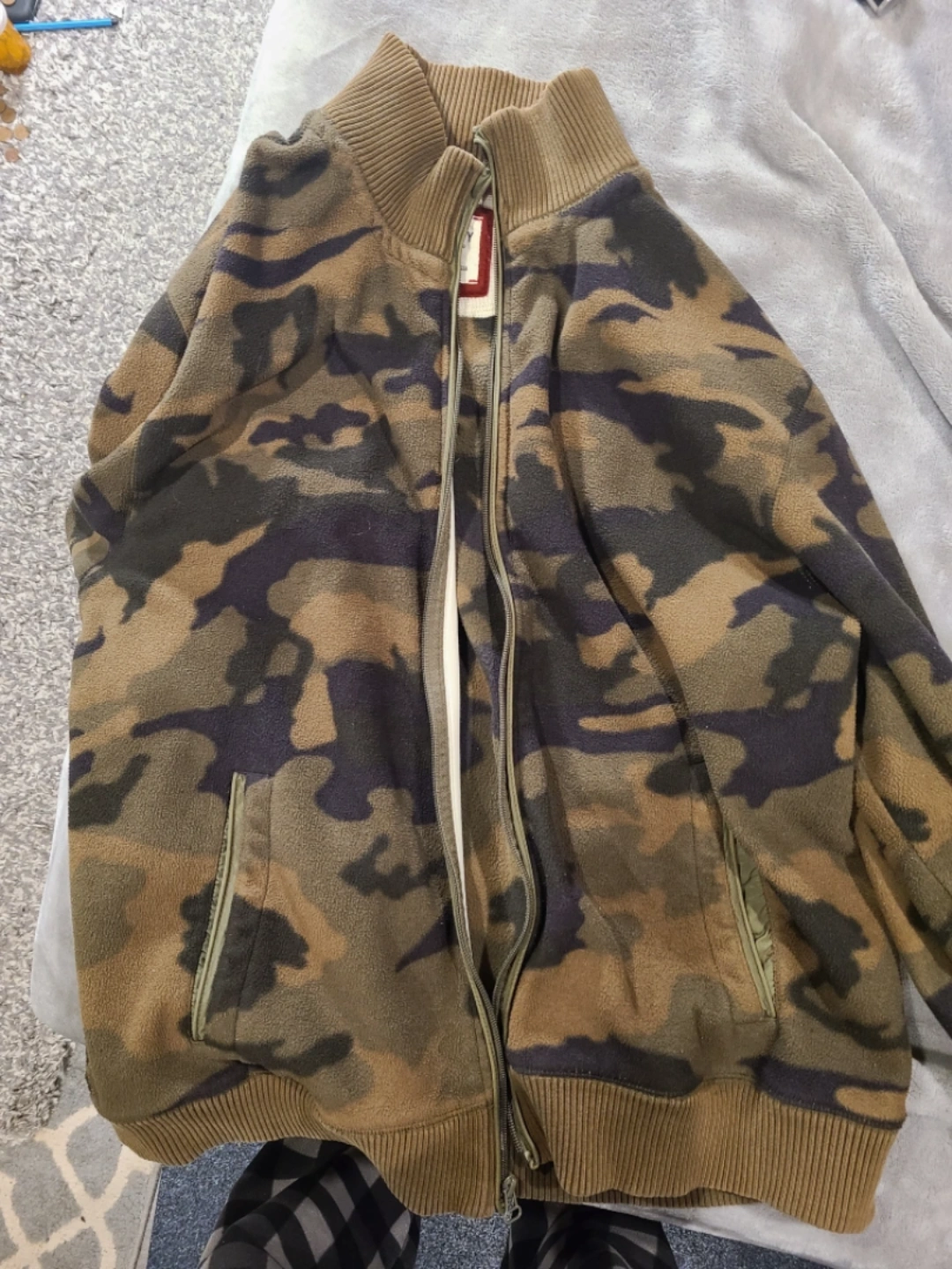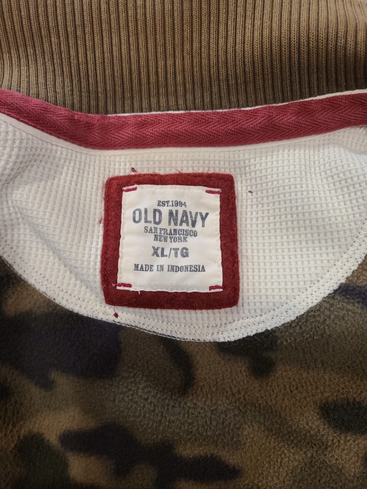 Camouflage fleece zip-up jacket. Size XL/TG. Made in Indonesia.