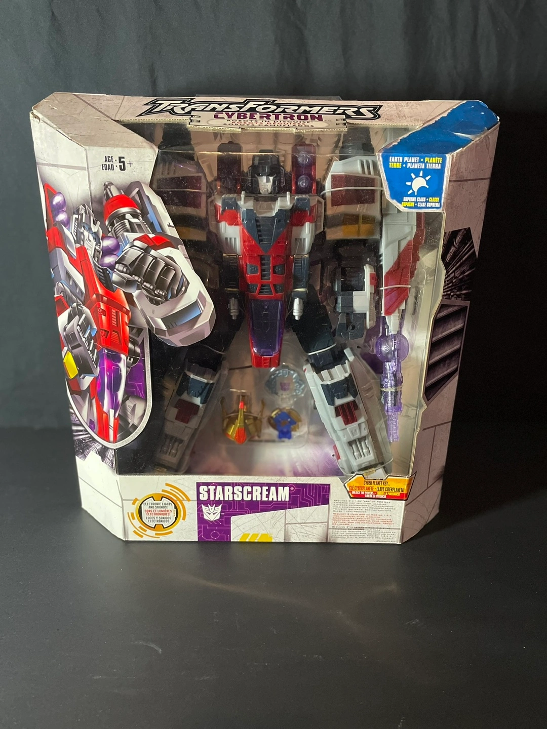 Transformers Cybertron Starscream action figure. Comes with accessories. Has electronic lights and sounds. Converts from robot to jet mode.