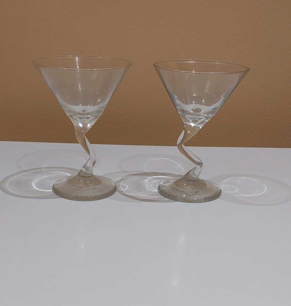 Set of 2 glass martini glasses. Twisted stems. Clear.