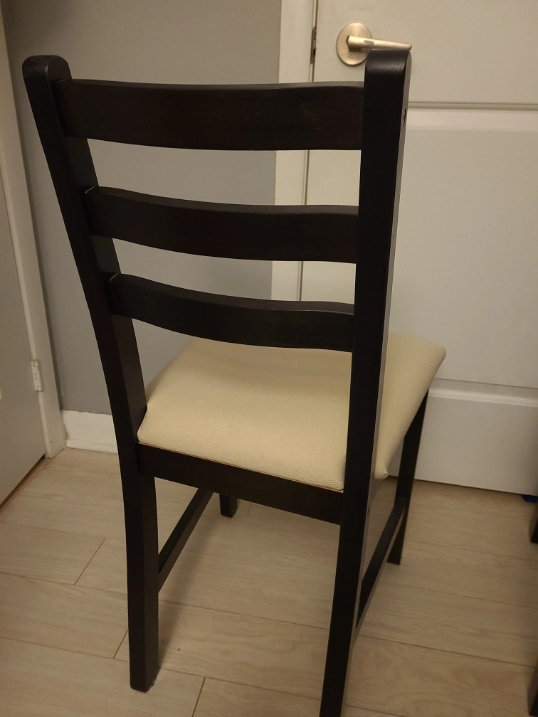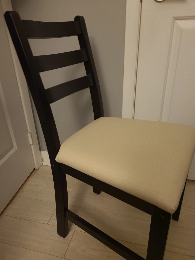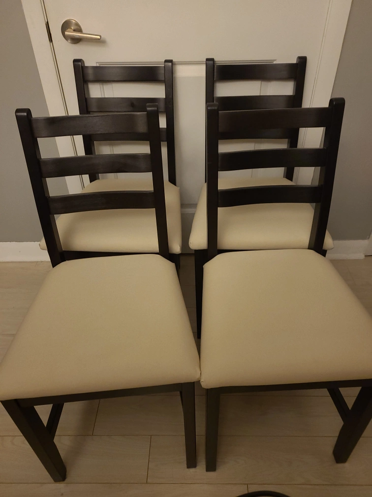 Set of four, solid pine dining chairs with a dark brown frame and beige coloured upholstery. Chairs come assembled. These chairs have been left in my storage unit, barely used, and are in excellent condition. Chairs must be sold together. Can include assembly instructional booklet if helpful. Max weight per chair: 243 lb Width: 16.5 in Depth: 19.25 in Height: 33.5 in Only available for pick-up in North York. Reach out if any questions!
