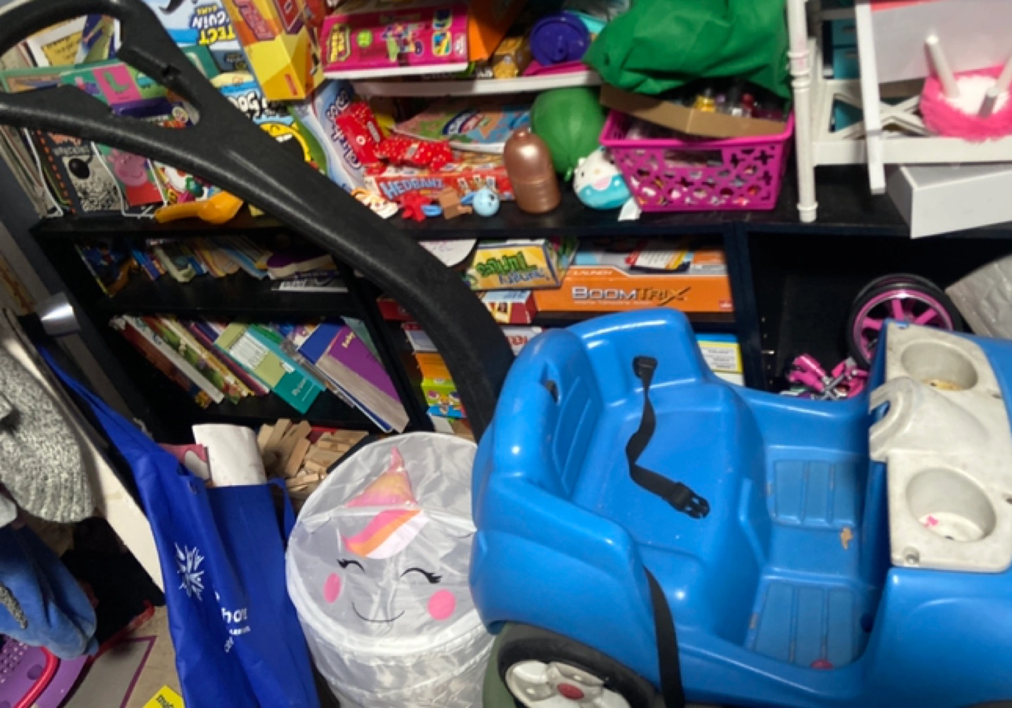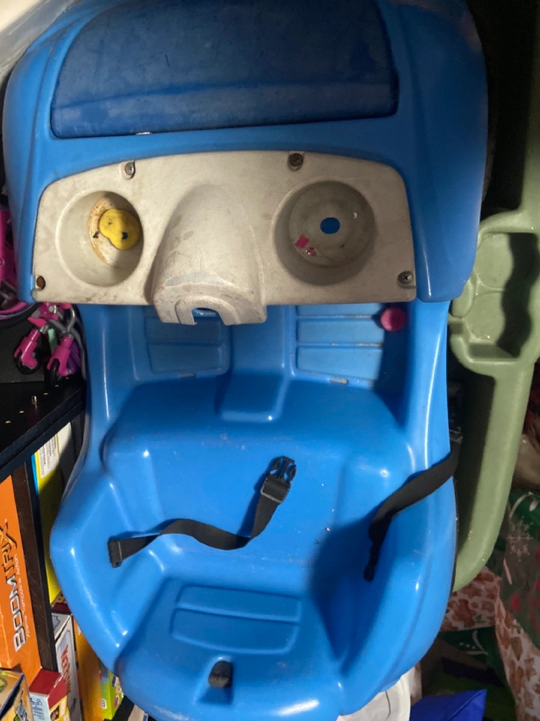 Blue ride-on car with missing steering wheel, seat belt, and wheels. Some wear and tear. It needs gone asap doing a huge cleanup and want it gone