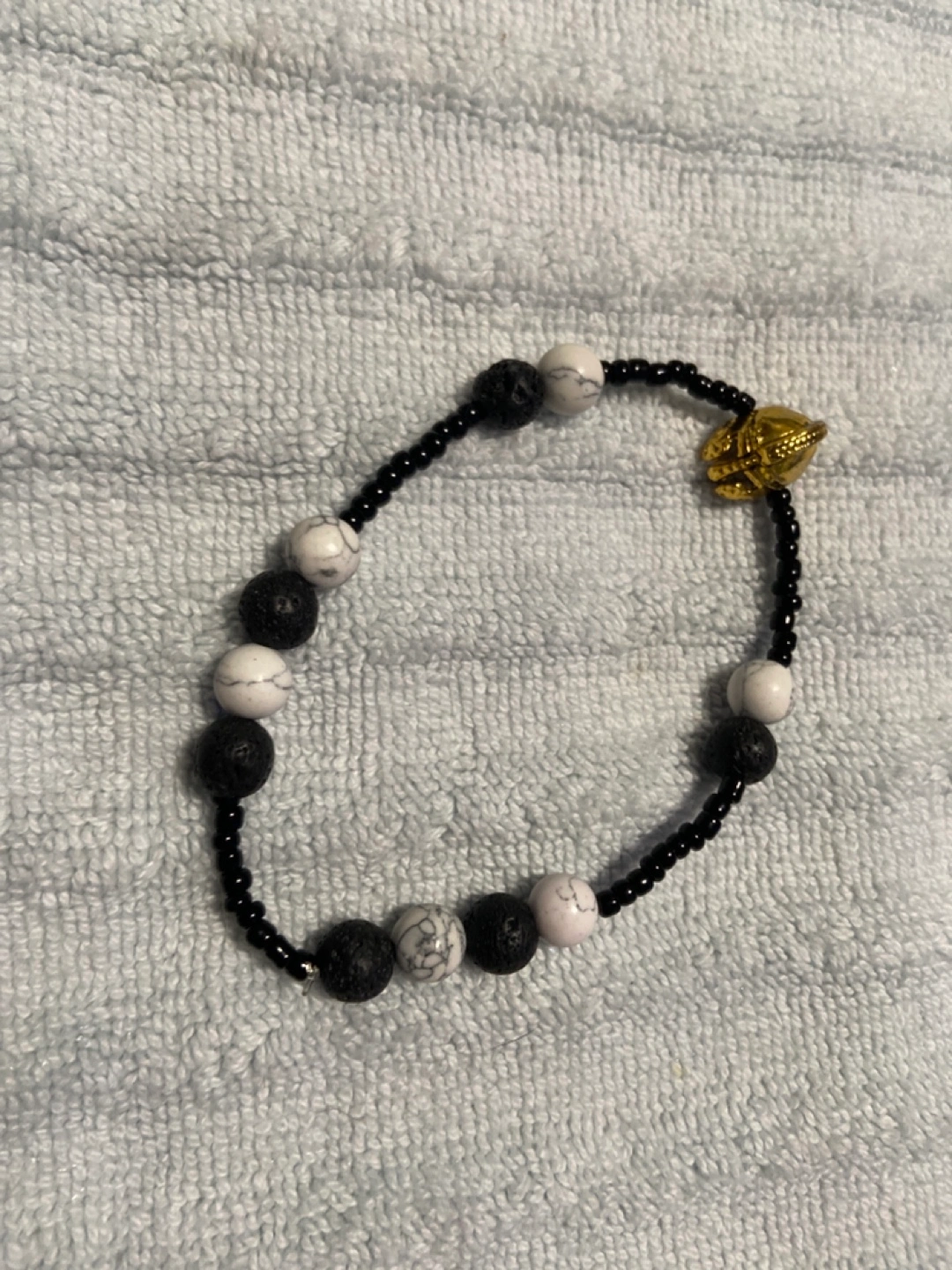 Hand crafted Black beaded bracelet with white and black stones. Features a gold Viking helmet charm.