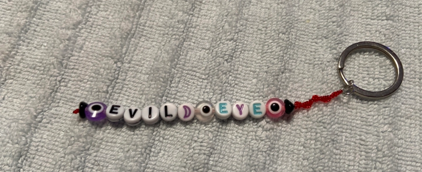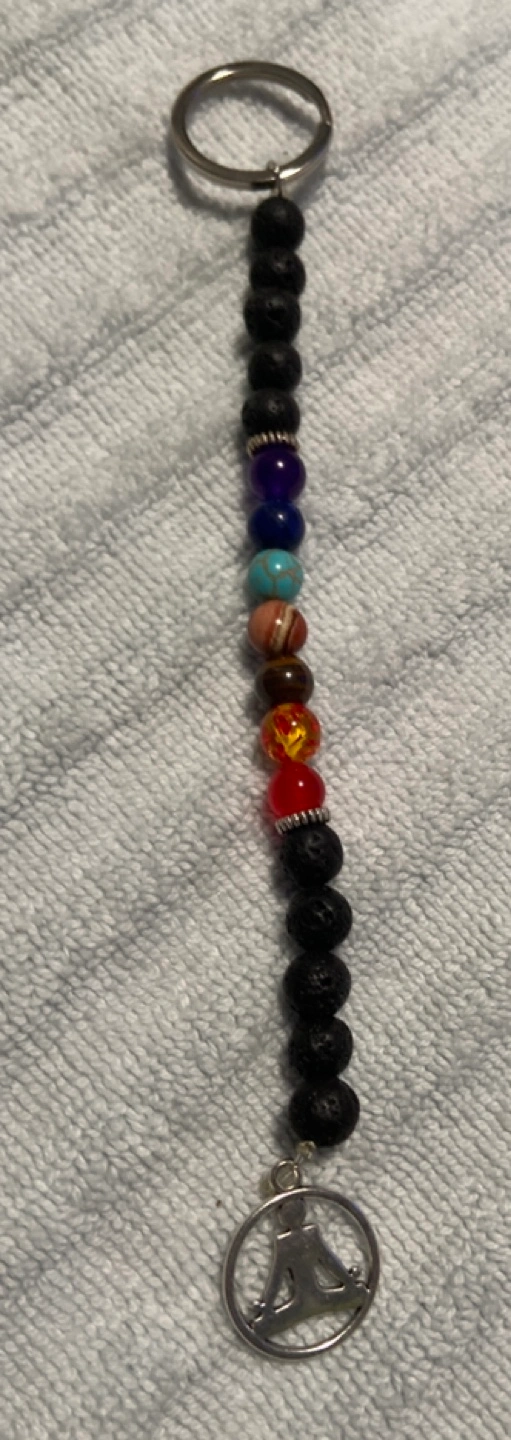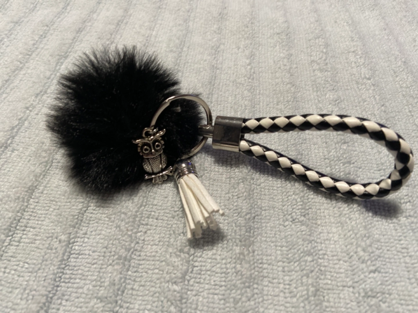 Each keychain is different. One has a black fur pompom and an owl charm. Another is blue and has a braided blue strap. One has a beaded chain with different colored beads and a meditating figure charm. Another is green with a green braided strap and feathers. The last one is a beaded keychain that spells 'Evil Eye'.