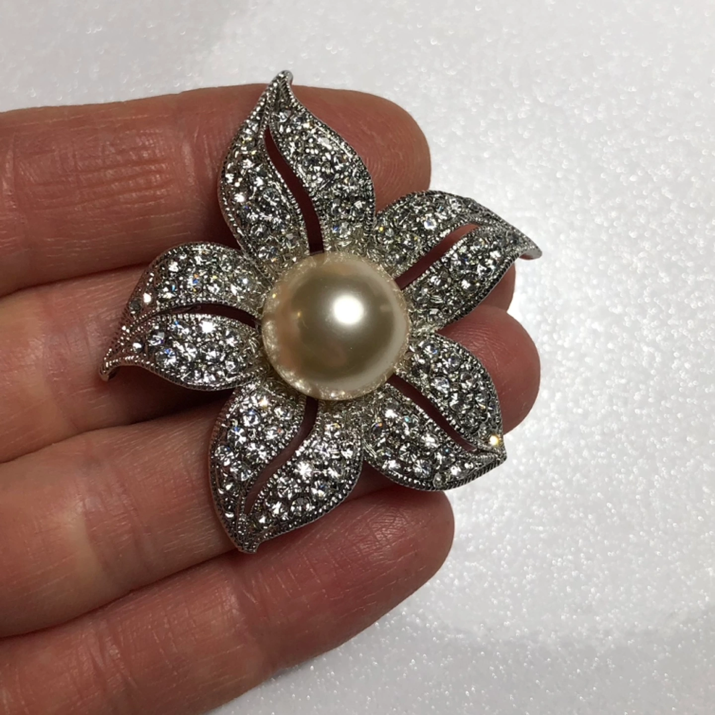 Silver flower brooch covered in rhinestones, with a large pearl set in the centre. Beautiful and unique piece.