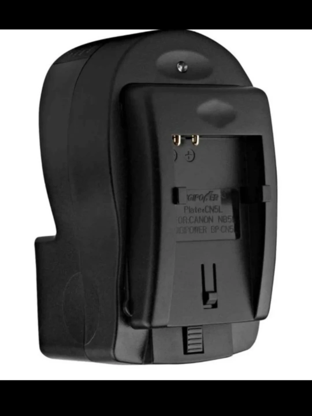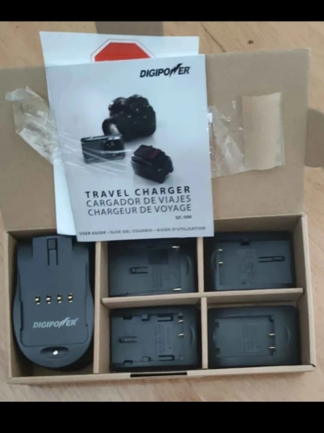 Travel charger for Canon batteries. Includes charger, four battery plates, and user manual.