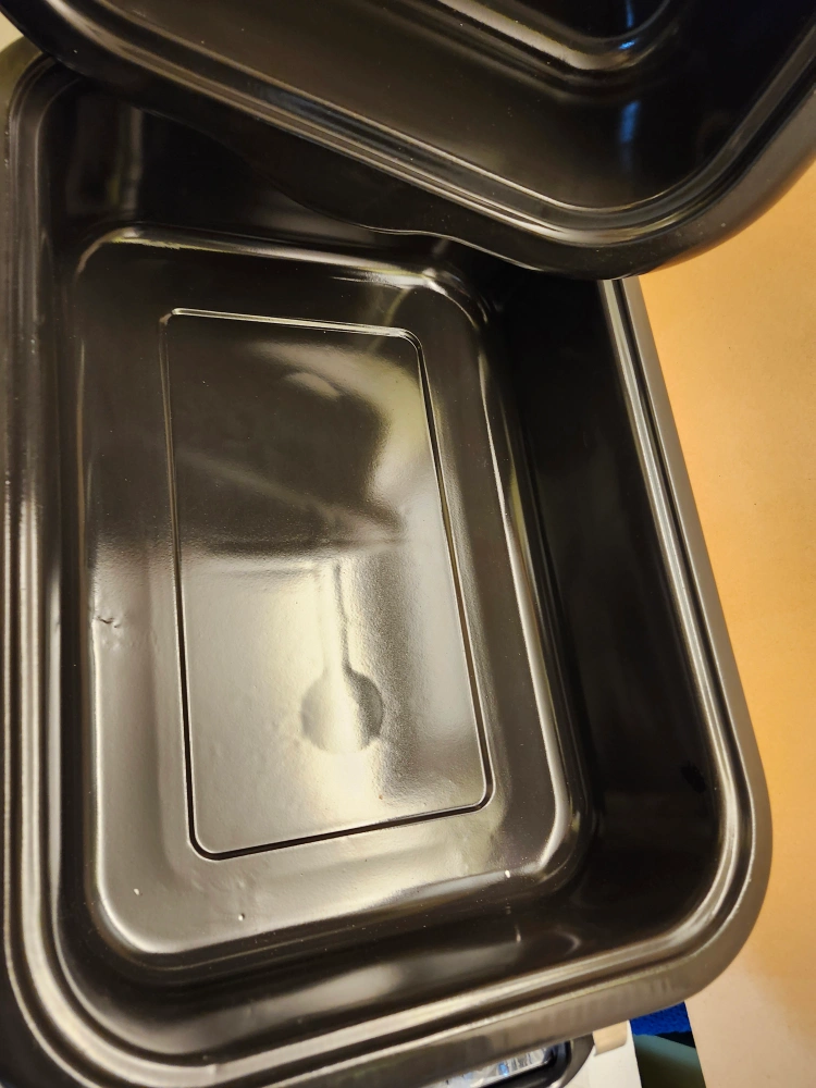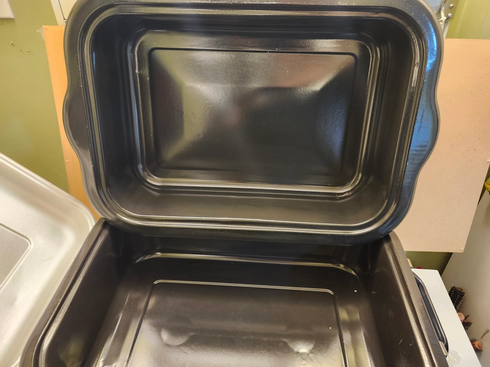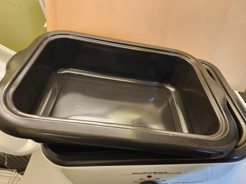 Electric roaster oven with a large capacity. Features a temperature control knob, a removable rack, and a lid with a handle. price only cash only pickup no delivery 801 O'Connor drive outside TD Canada Trust bank door. East York