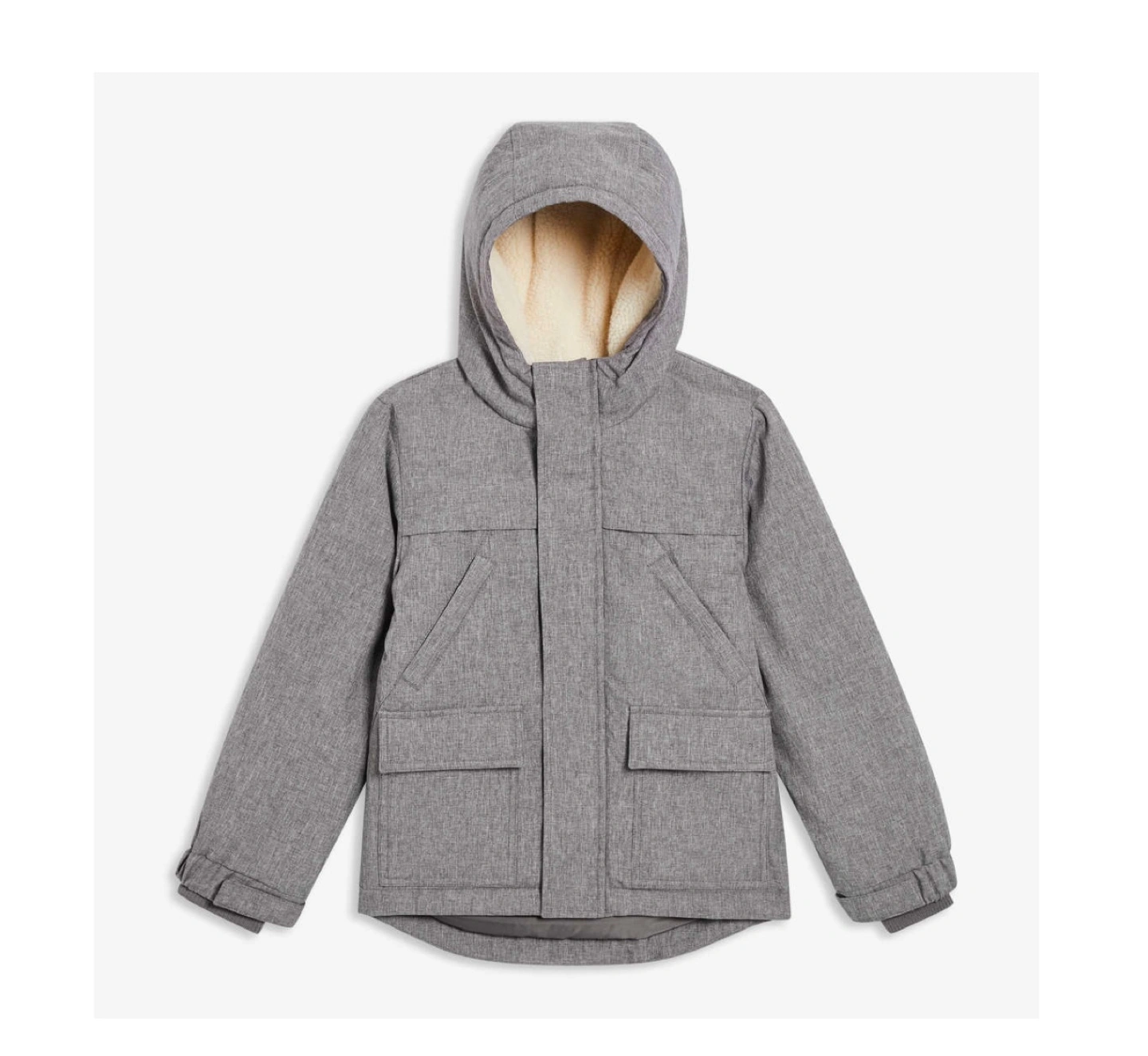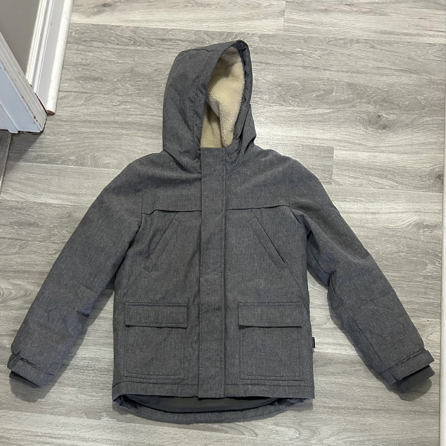 Grey winter jacket with fleece lining and hood. Features PrimaLoft insulation. Size 10-12.