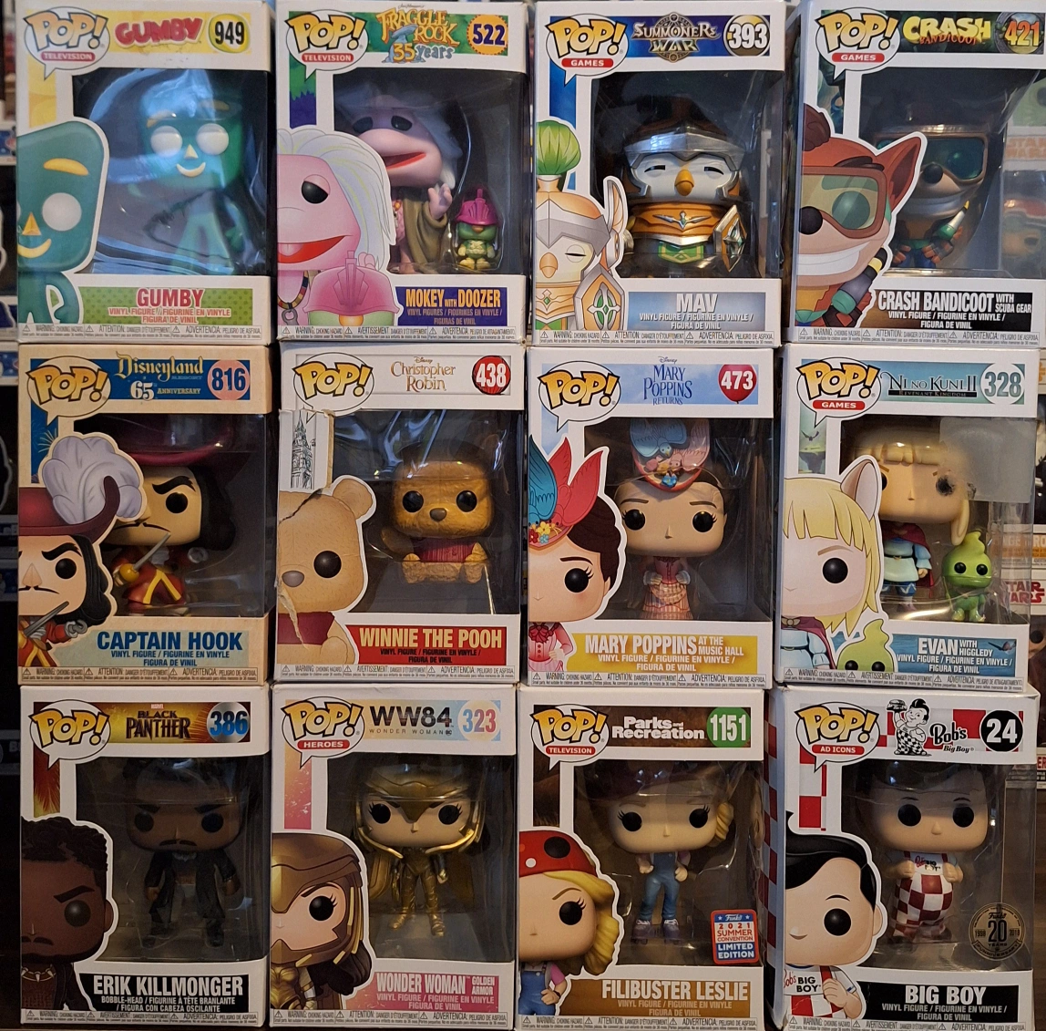$150 OBO. Cash only, please. *individual prices Erik Killmonger $20 Wondering Woman $15 Filibuster Leslie $15 Big Boy $15 Captain Hook $10 Winnie The Pooh $25 Mary Poppins $10 Evan $15 Gumby $25 Mokey $35 Mav $10 Crash Bandicoot $25 (boxes have varying condition from excellent to worst, but Funkos are in mint condition) Door Pickup. Available all day Saturday or Mon-Fri after 6pm.