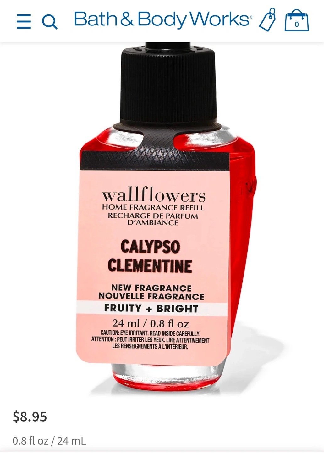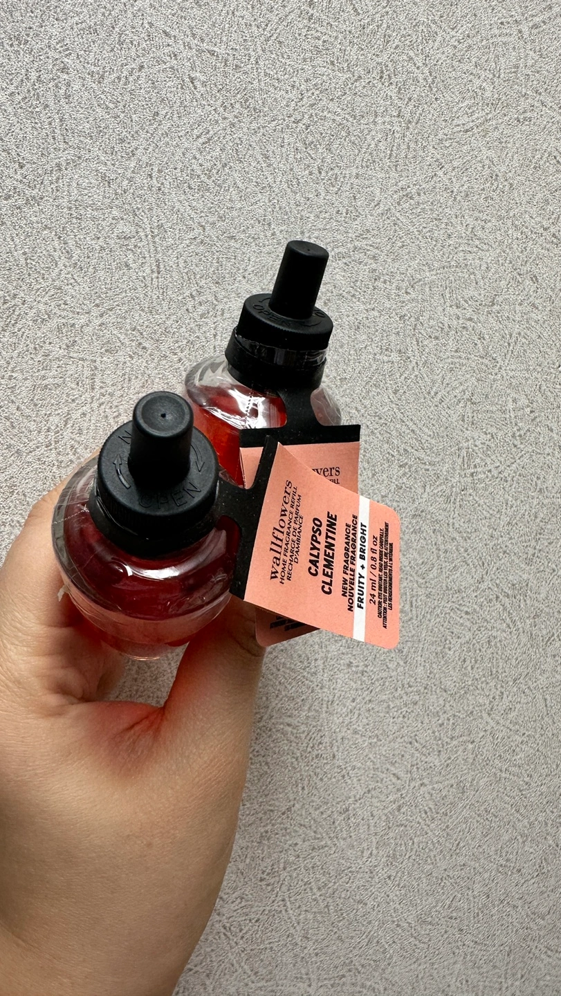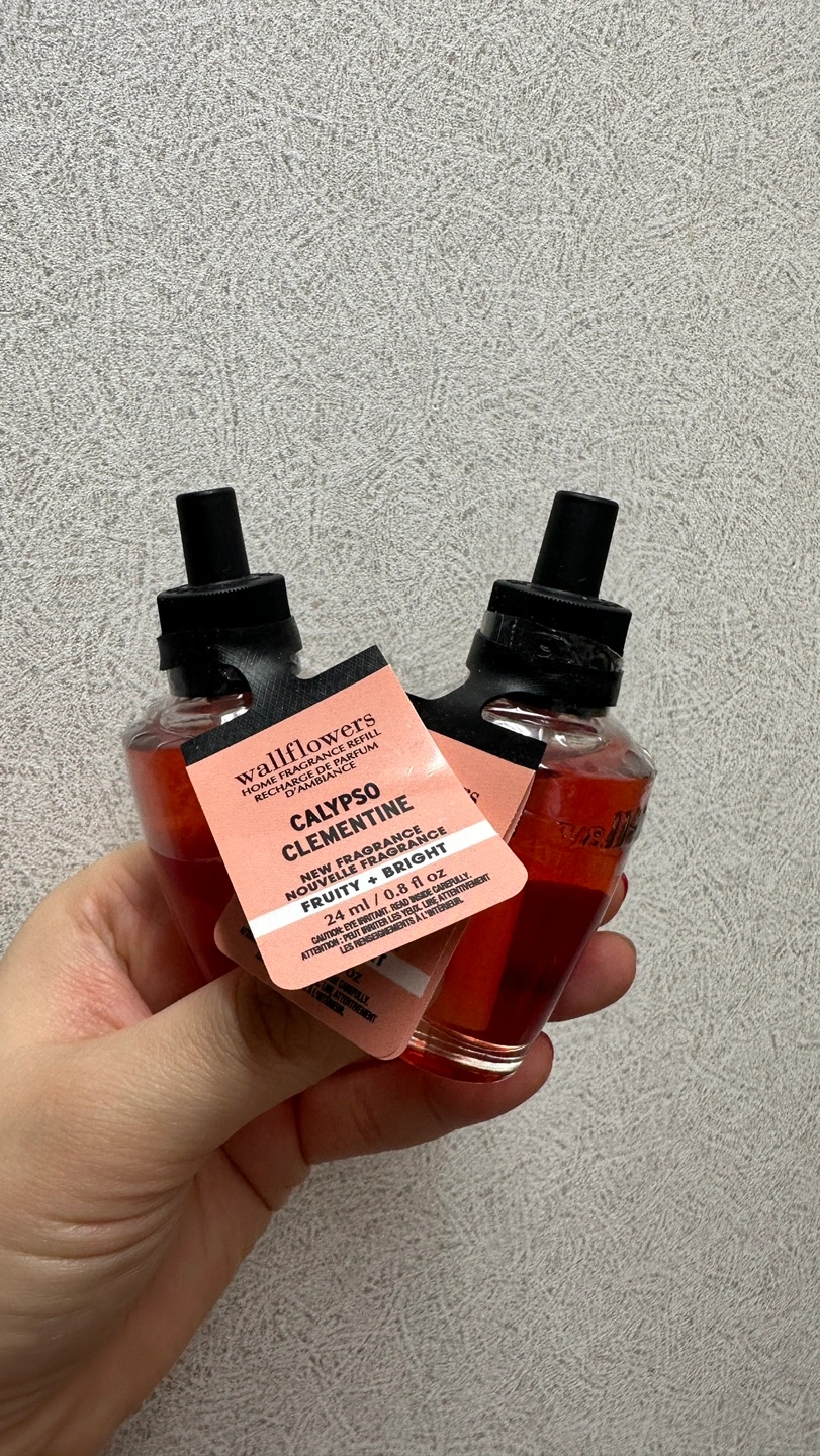 This is a set of 2 Bath & Body Works’ wallflower refill in Calypso Clementine scent. Fragrance notes are juicy clementine, neroli nectar and coastal woods. With this scent, your room would be filled with fruity and bright feeling, leading to light and citrusy celebration. Both of them are new. If you’re not a fan of strong scent, then could be a good fit for you. Retail price: $8.50 each 24mL / 0.8 fl oz