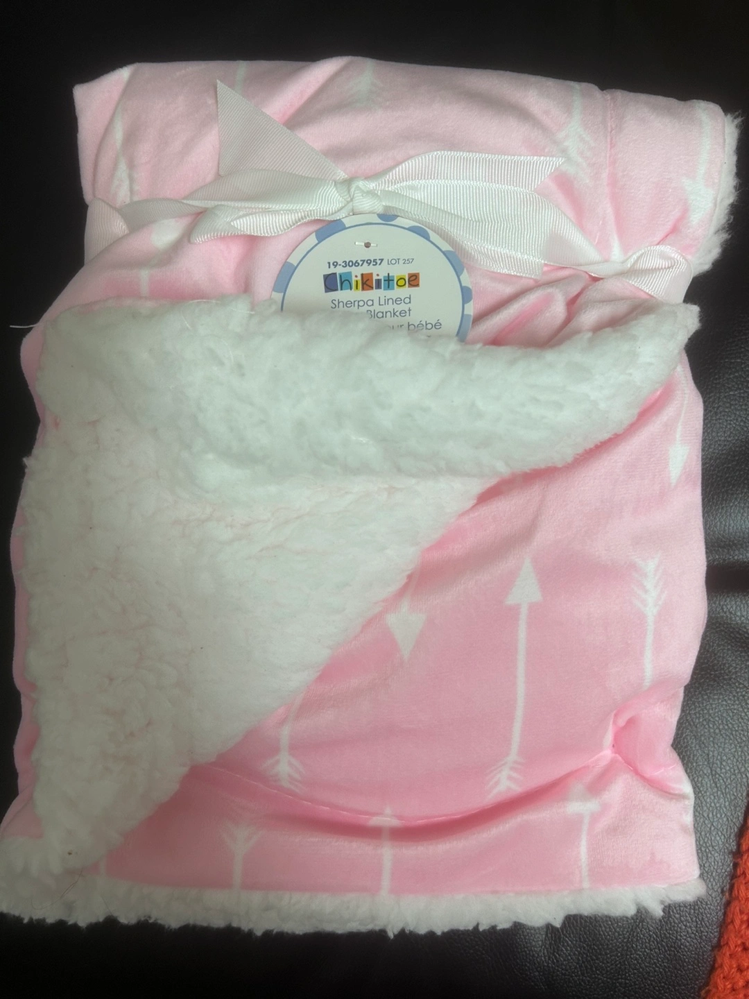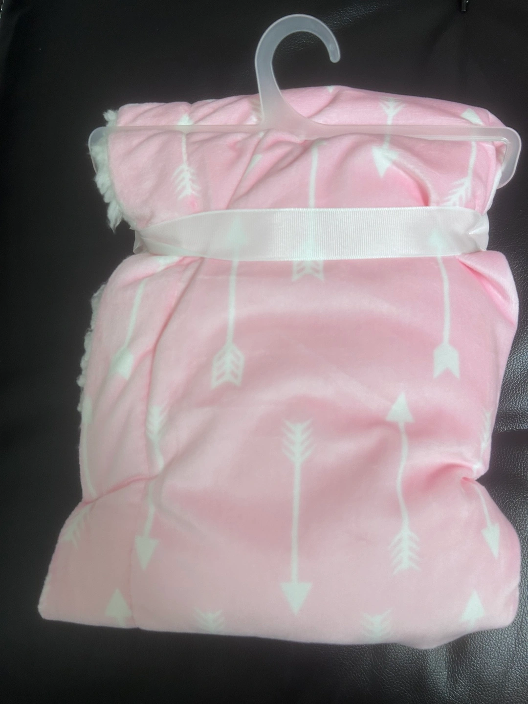 Pink Sherpa lined baby blanket with white arrow print. New with tags.