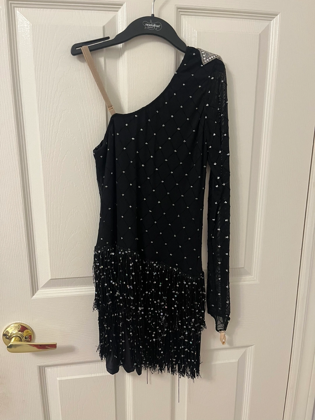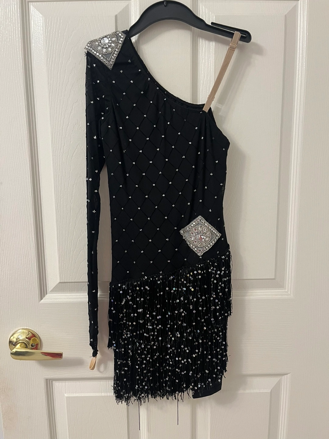 Black dance dress with rhinestones, one long sleeve, and fringe. Off shoulder with nude adjustable strap and stretchy fabric and leotard