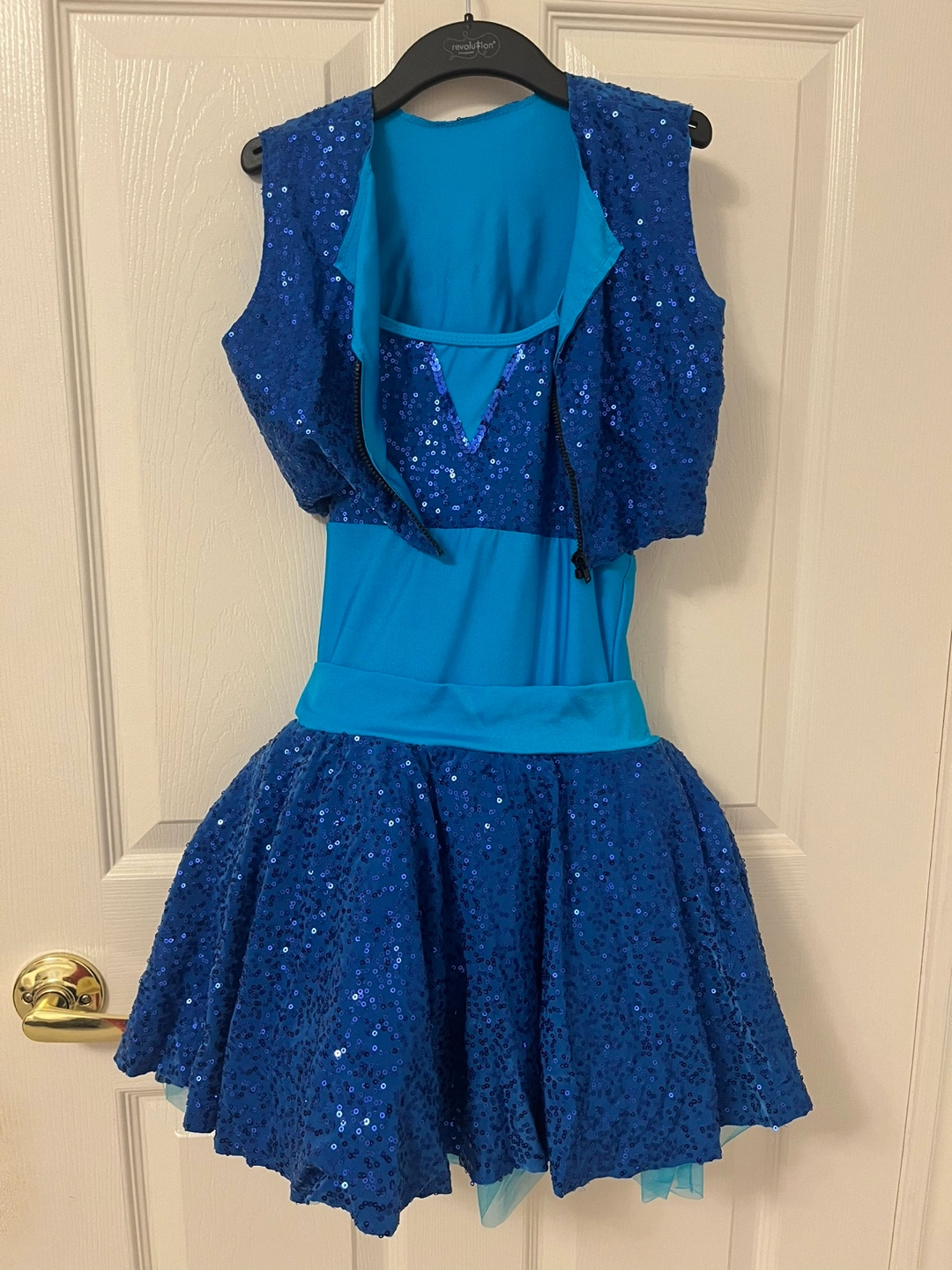 Blue dance costume with a sequined vest. The dress has a tulle skirt and a sequined top Comes with a sequin vest & skirt & gloves