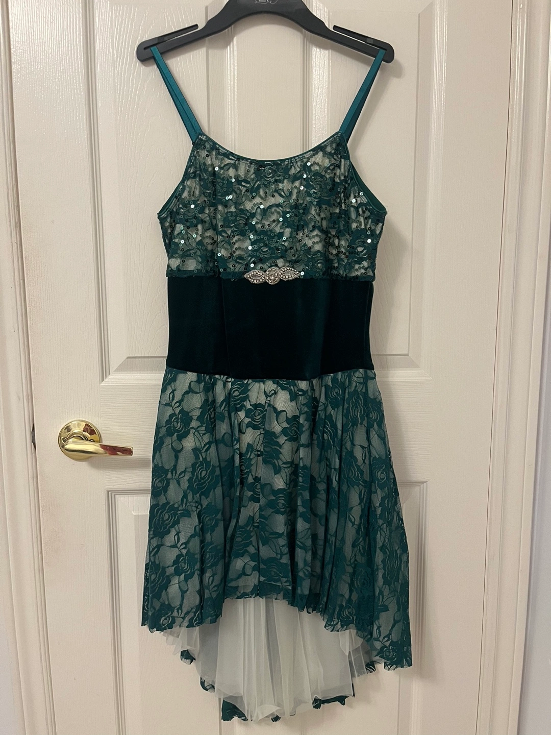 Green dance dress with a velvet sash and sequined bodice. The dress has a tulle overlay and a high-low hemline. Stretchy fabric with semi-sequined top, velvet waist, flowy lace skirt Leotard & adjustable straps