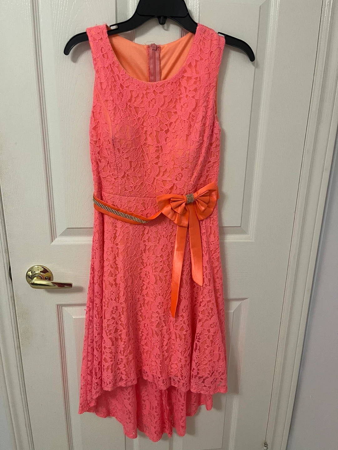 Salmon color padded high low lace dress with a salmon satin belt and bow. The dress is fully lined. Wore it a few times & the fabric is a bit pilled Zip at the back