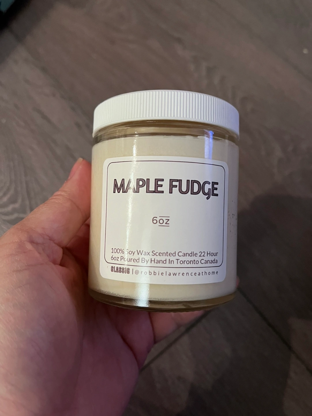 Soy wax candle, Glass jar, 6 oz, hand-poured in Toronto. 22 hour burn time. Maple Fudge scented. Never burnt.
