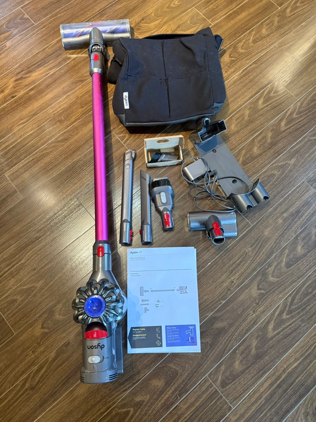 Dyson V7 Cordless Vacuum with all attachments, charger and carrying case. Includes manual. I used it for 4 years, some attachments are never used. It’s perfect for condos, small places. The main brush has some wear and tear ( you might want to replace it with a newer one if you wish) but it still works perfectly fine.
