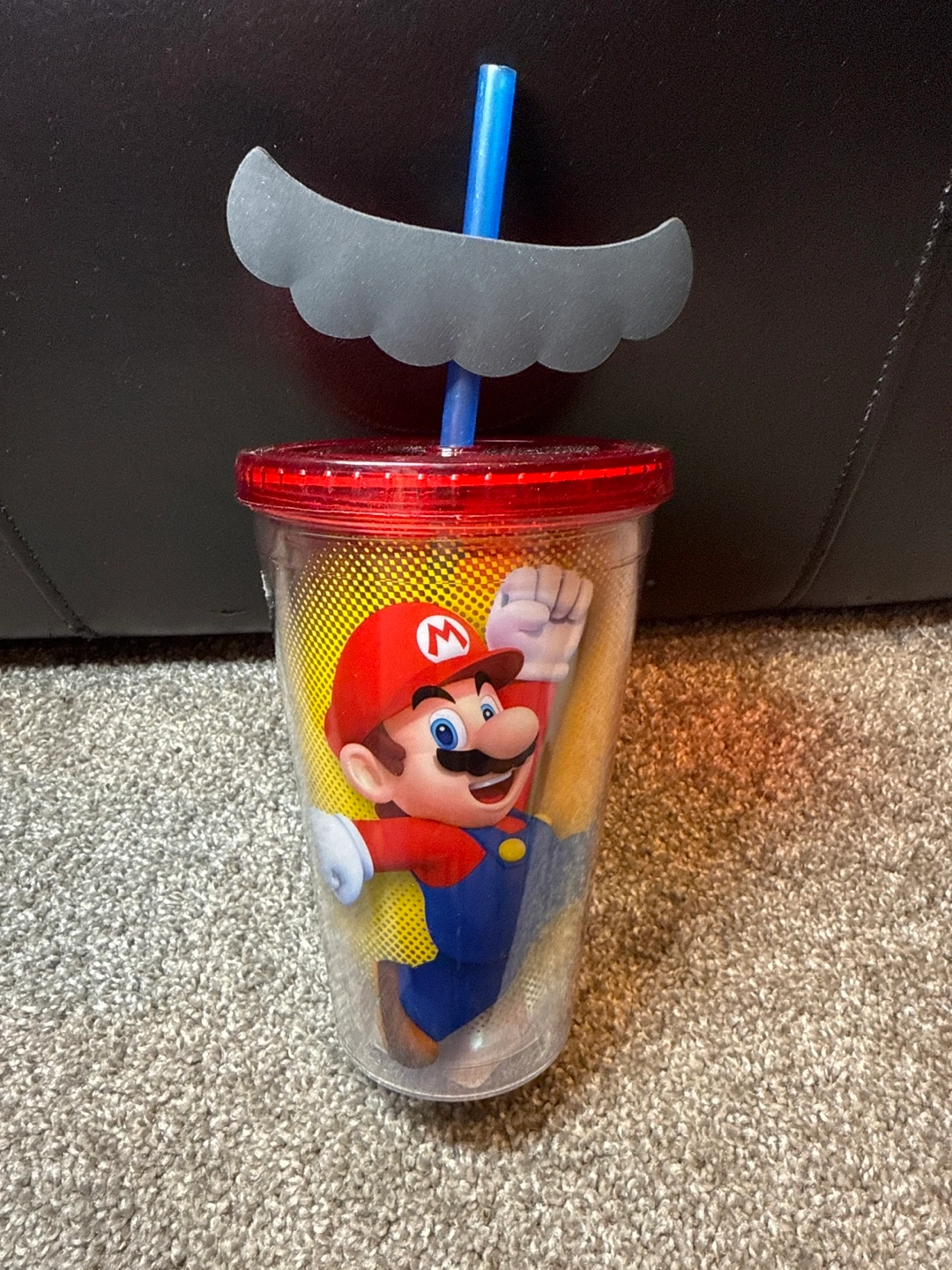 Tumbler with red lid and straw. Features Mario on the side. Brand new, never used.