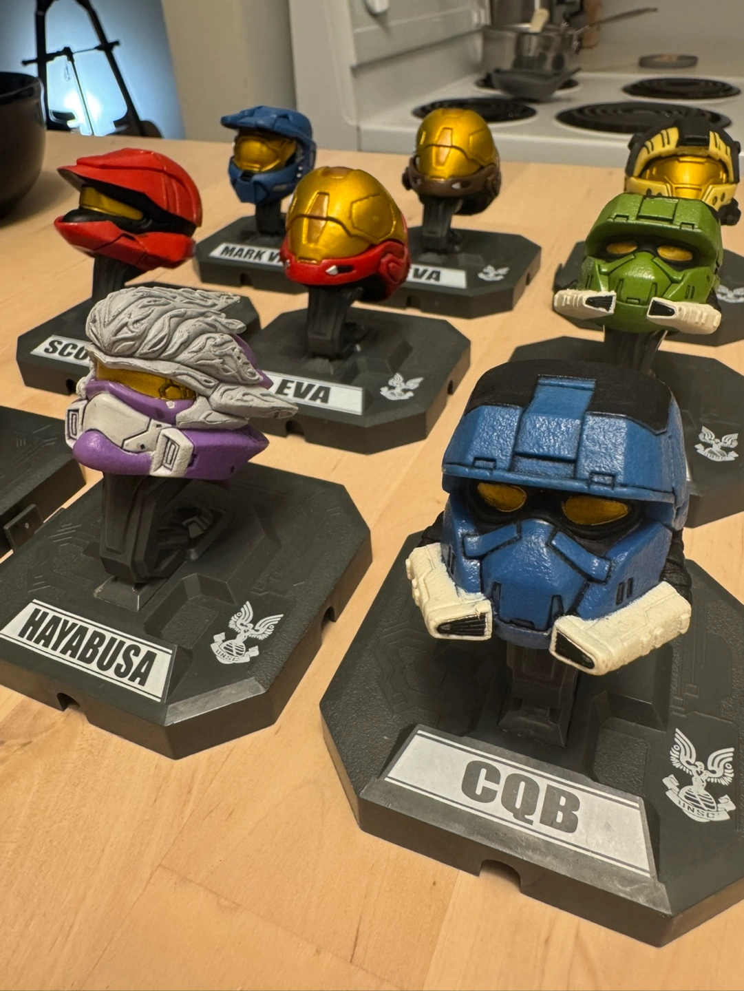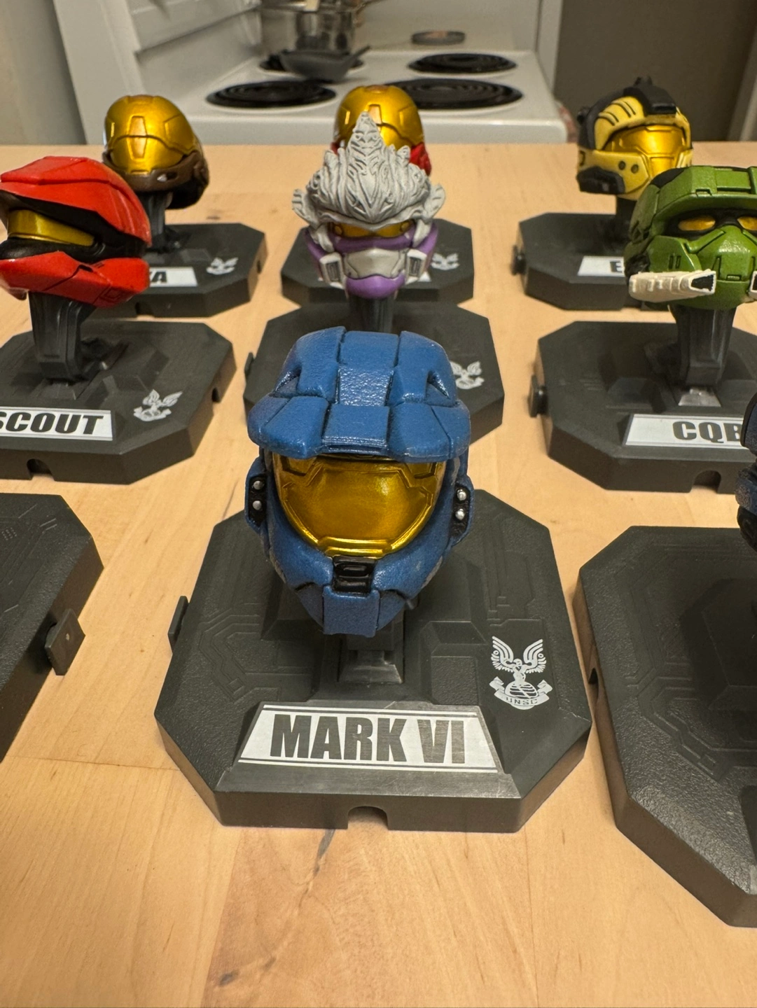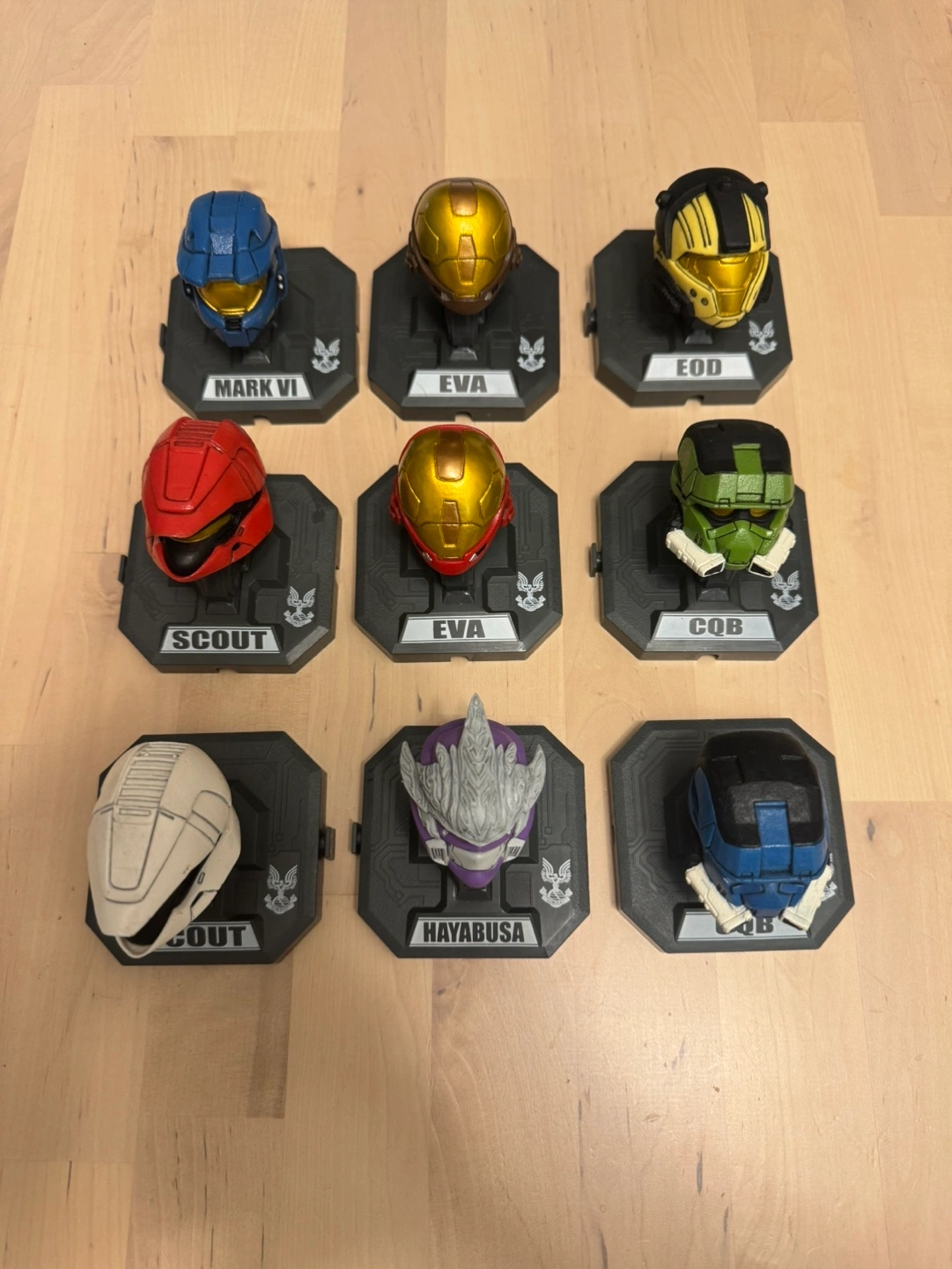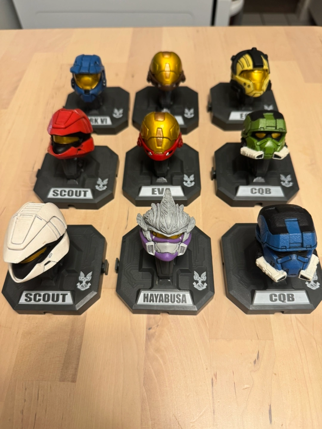 Set of 9 Halo mini figure helmets. Each helmet is on a small stand. Includes Mark VI, EVA, EOD, Scout, Hayabusa, and CQB helmets. All made by McFarlane toys