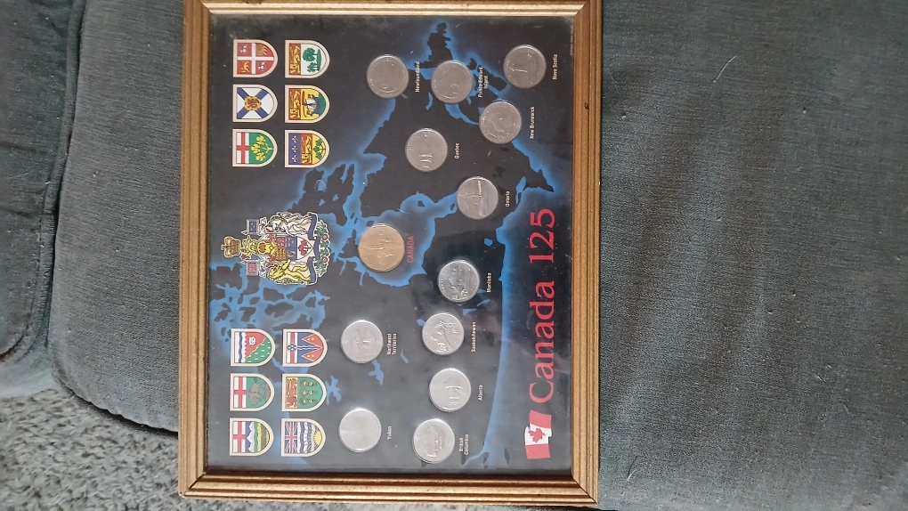 Framed collection of Canadian coins. Includes coins from each province and territory.