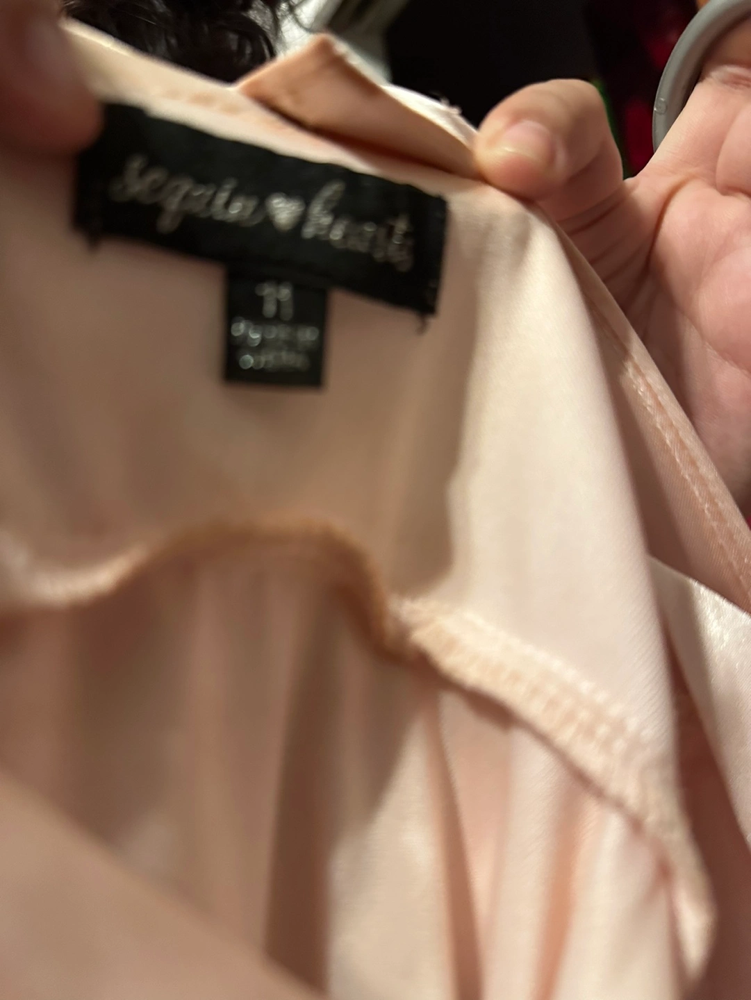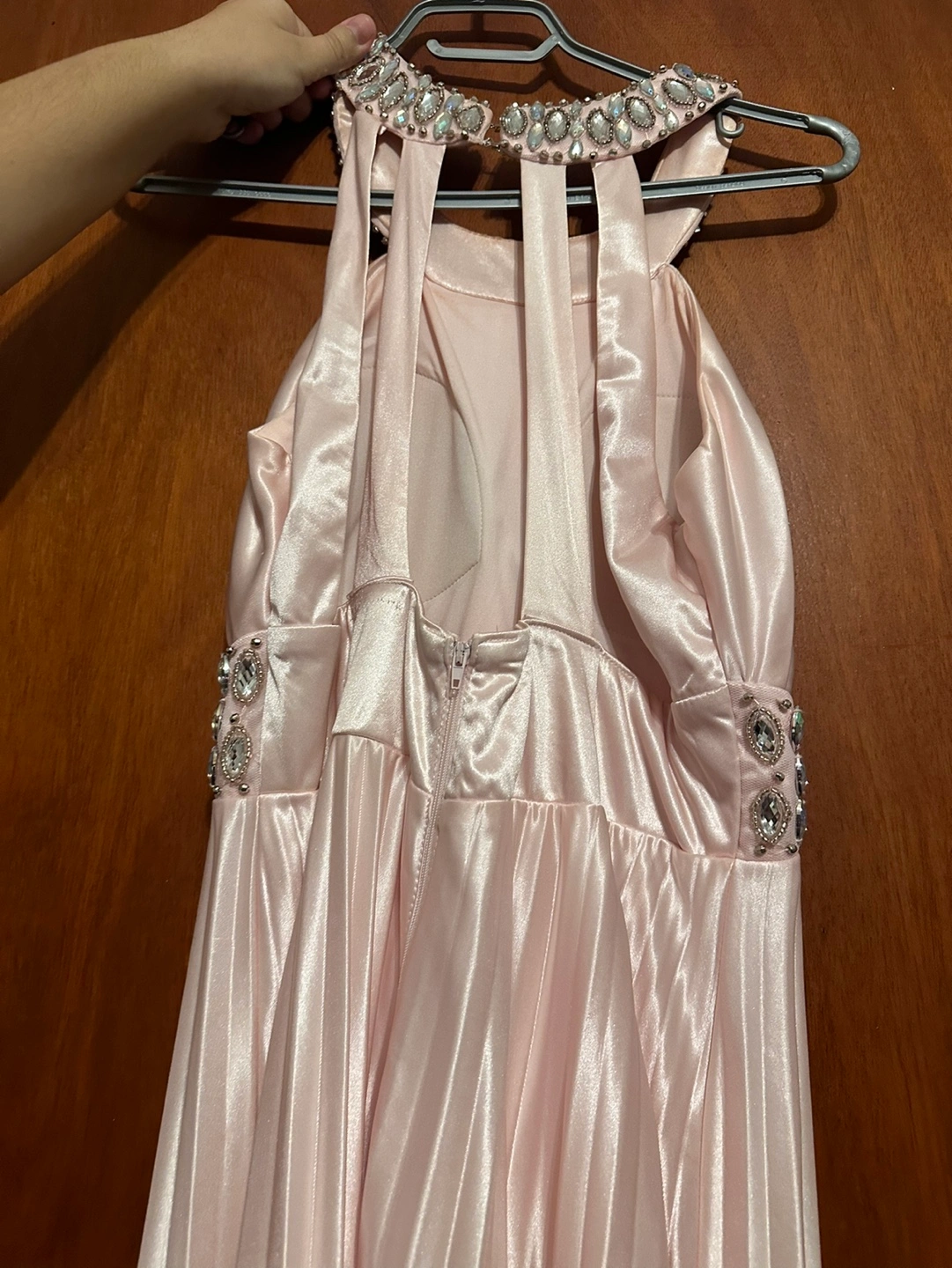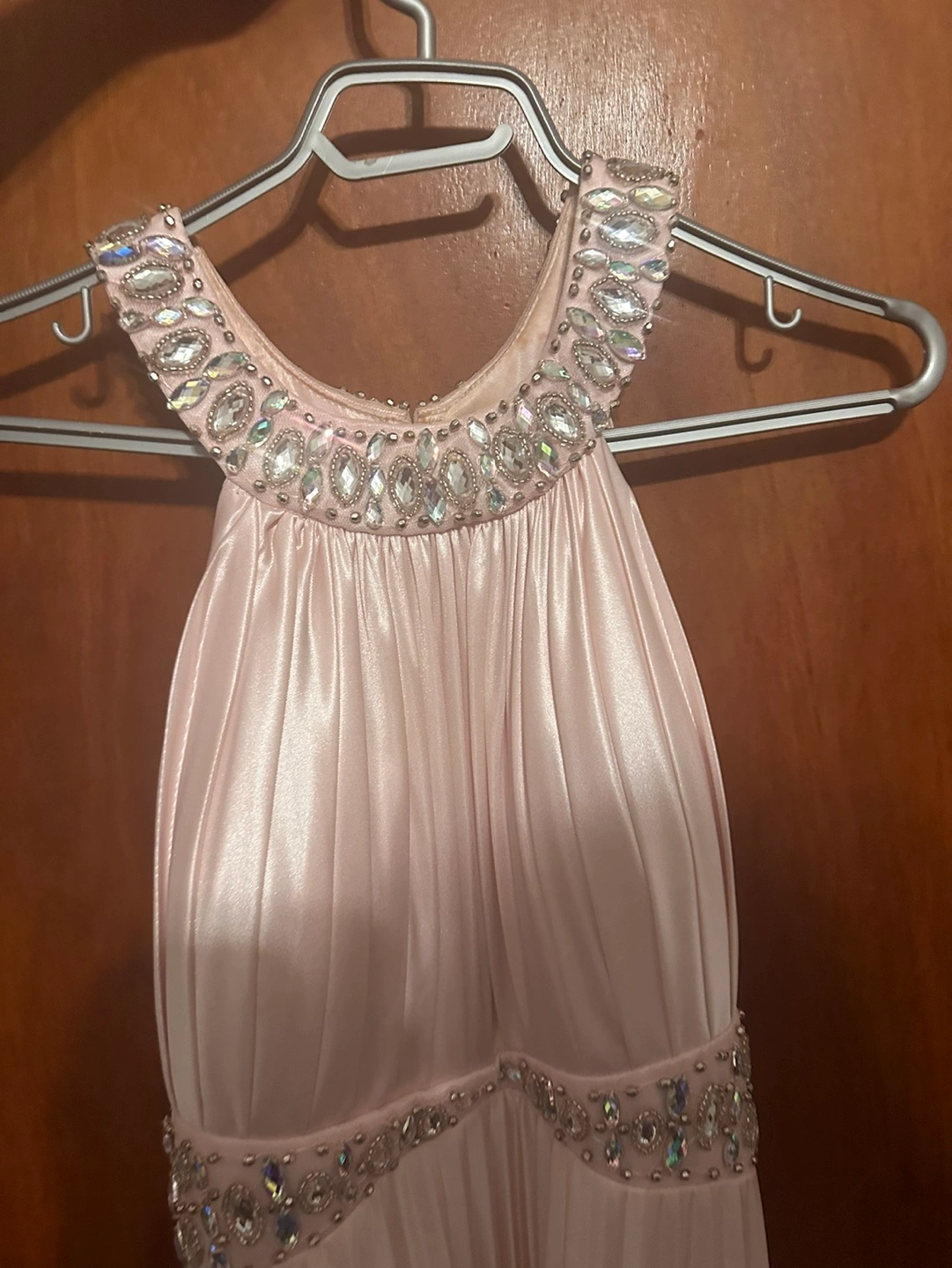 Pink halter dress with sequins on the neckline and waistline. Pleated material. Size 11.