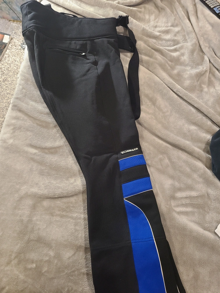Black ski pants with blue and white accents. Leather patches on the bottom. Zippered pockets on one side and on the back. Vintage new never used.