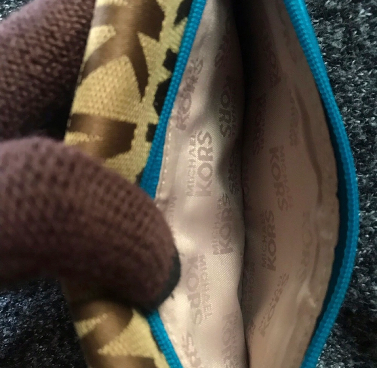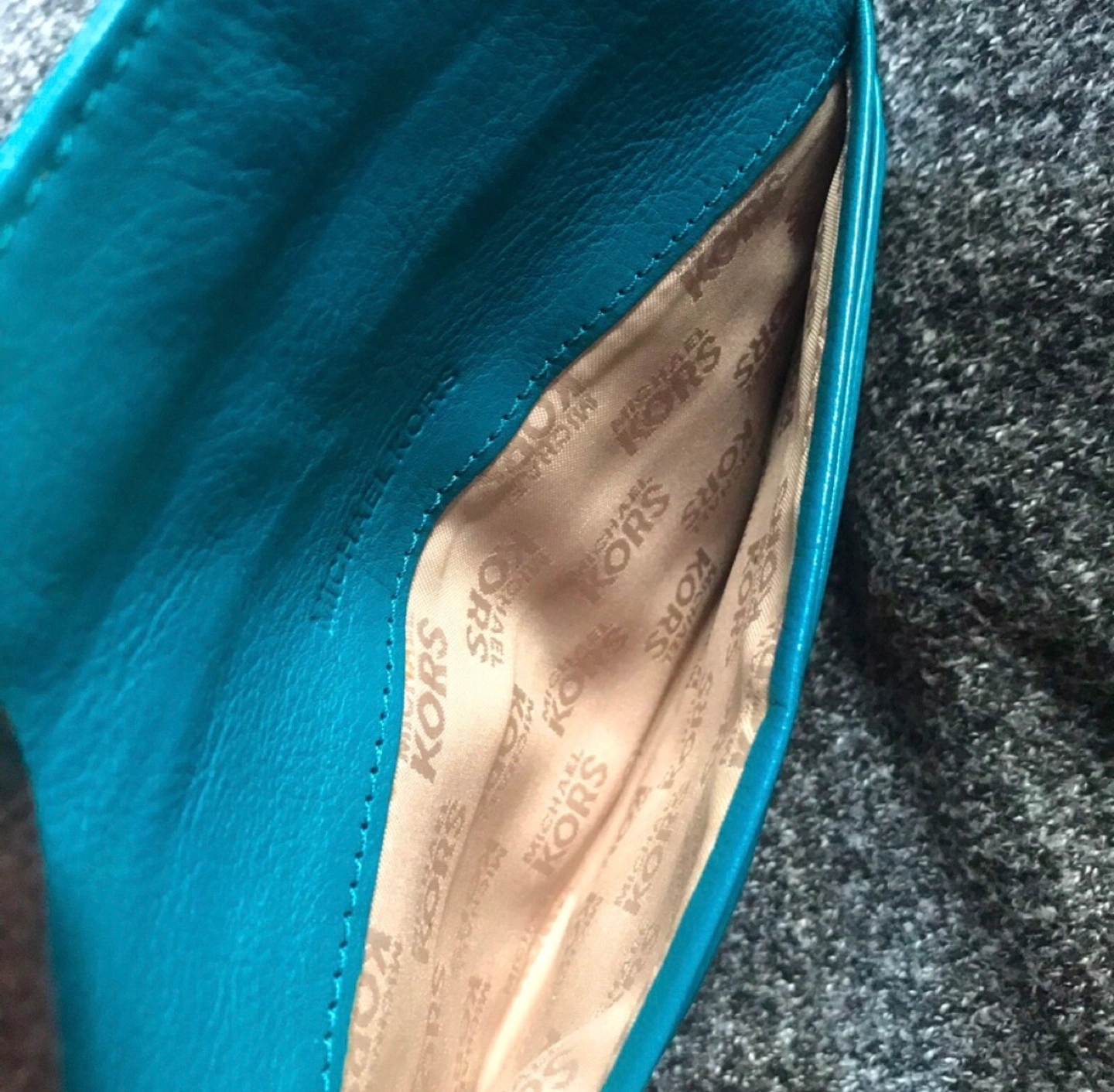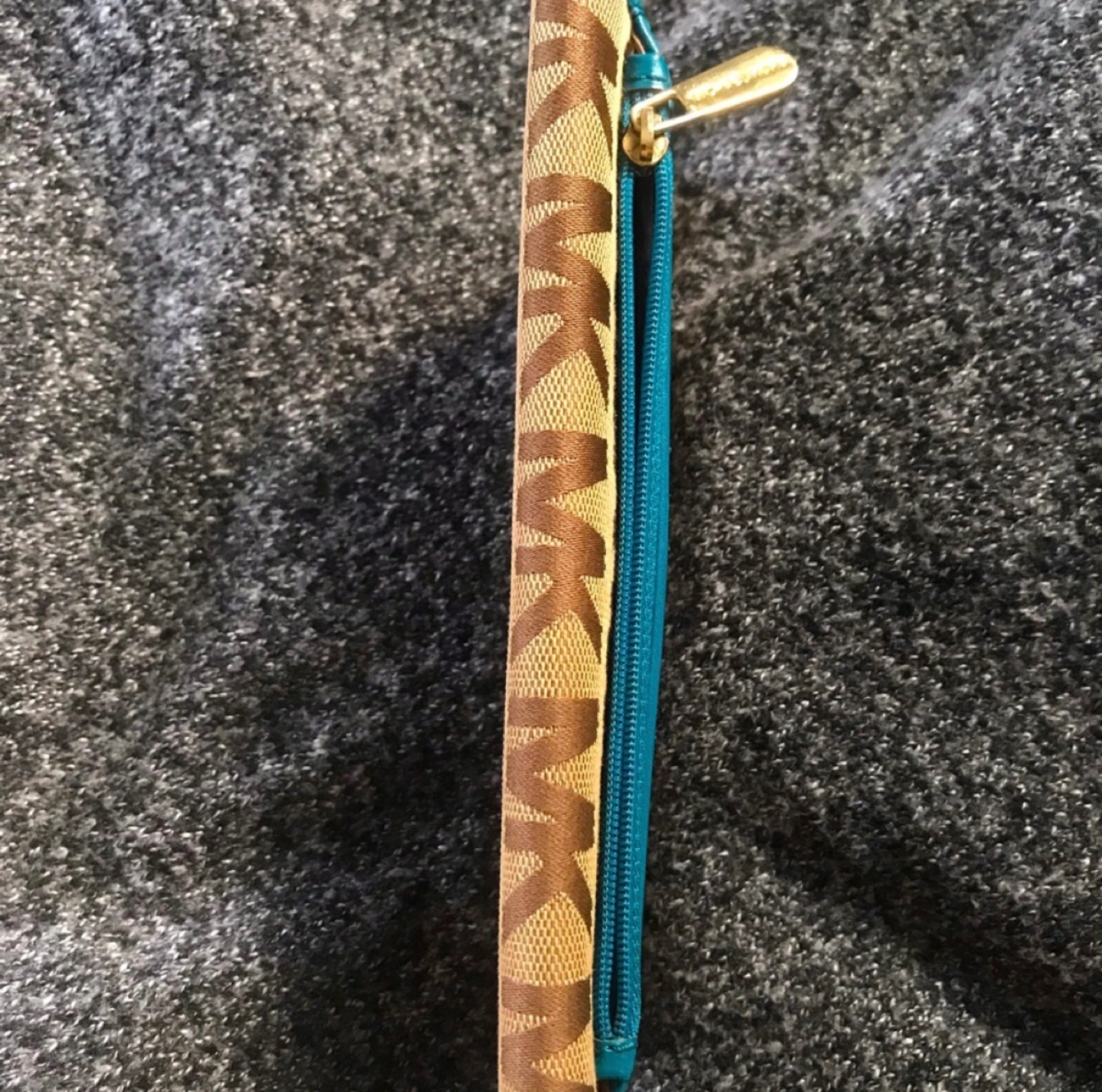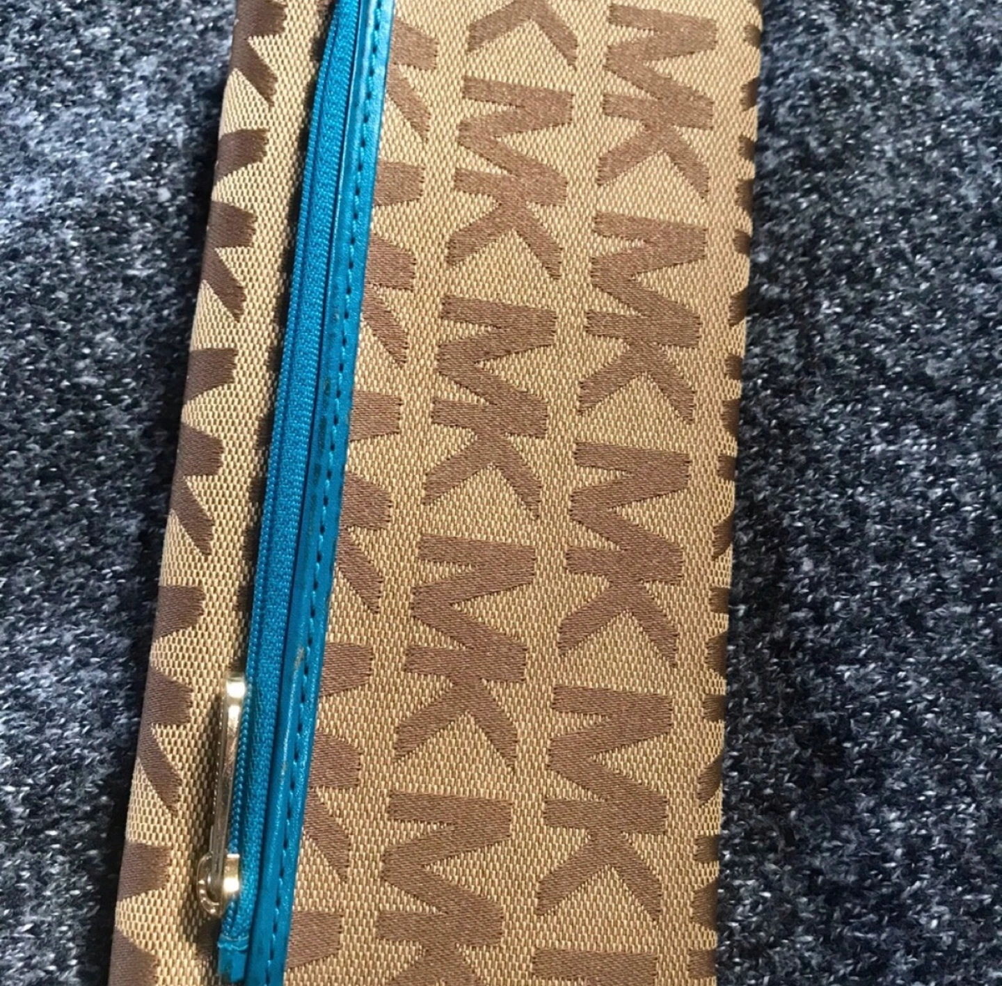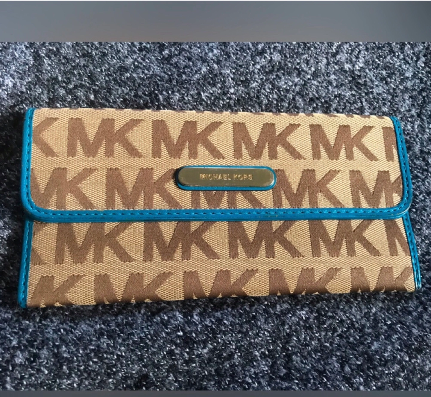 Michael Kors ~ AUSTIN Signature Flat Slim Continental Canvas Wallet πΈ MK monogram Colors: Tan Brown | Teal Blue 4x Credit Card Slots 1x Exterior Zip Pocket Interior Billfold Pocket Double Snap Closure Embossed Michael Kors logo inside Gold tone Michael Kors Logo plaque Measurements: Height: 3.75β Width: 7.5β Depth: >.25β