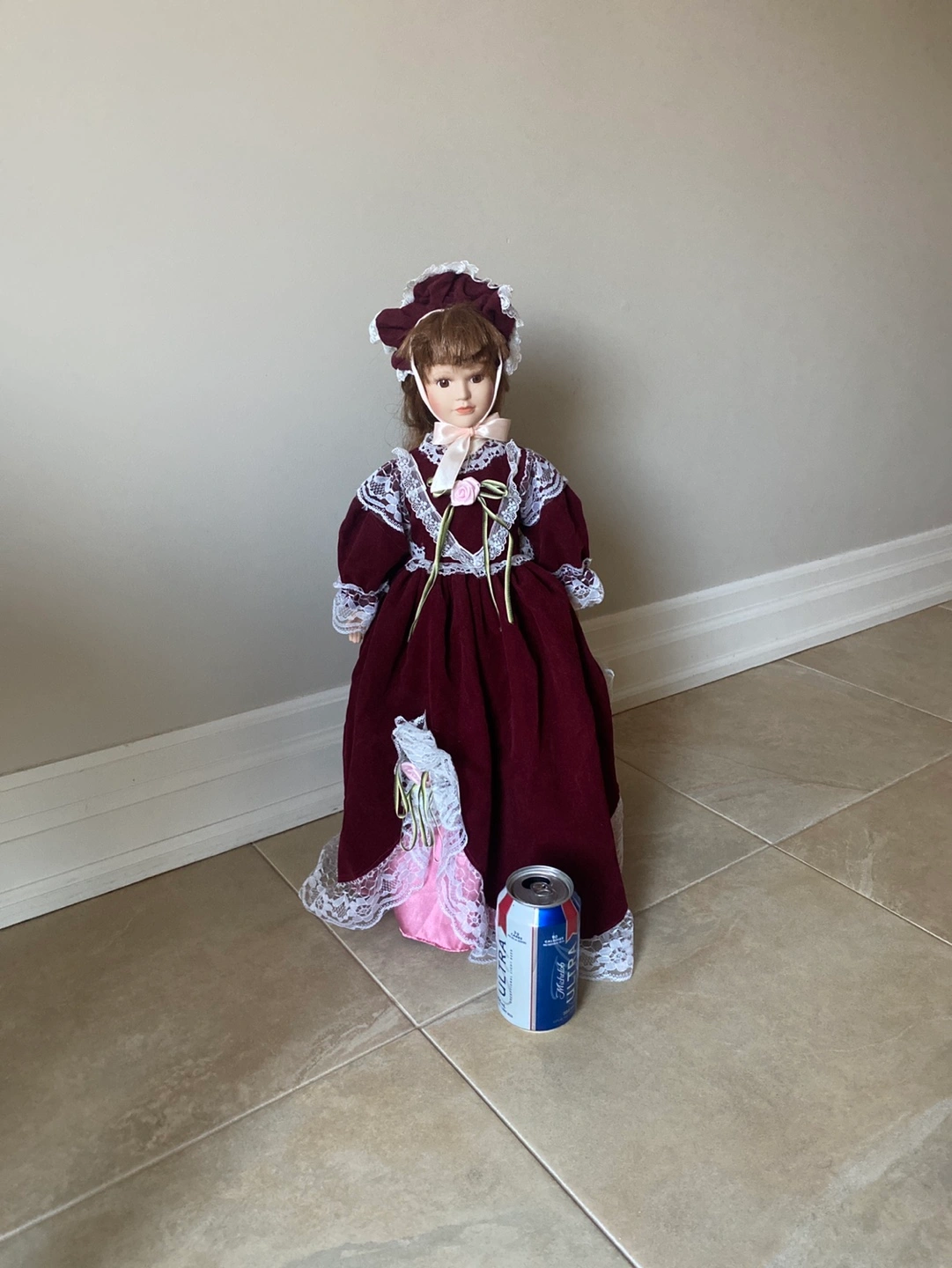 Vintage porcelain doll in a burgundy dress with lace detailing. In excellent condition had this doll on display only. Doll is 22 inches tall. Display Stand Included.